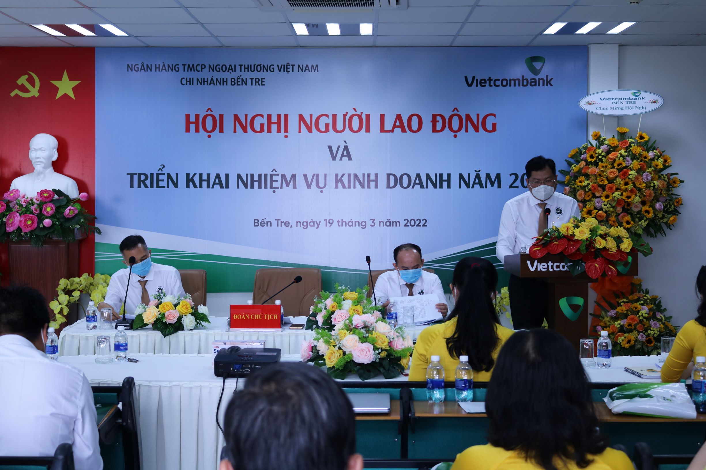 Ông Trần Văn Thuận - Bí thư Chi bộ, Giám đốc Vietcombank Bến Tre phát biểu tại hội nghị