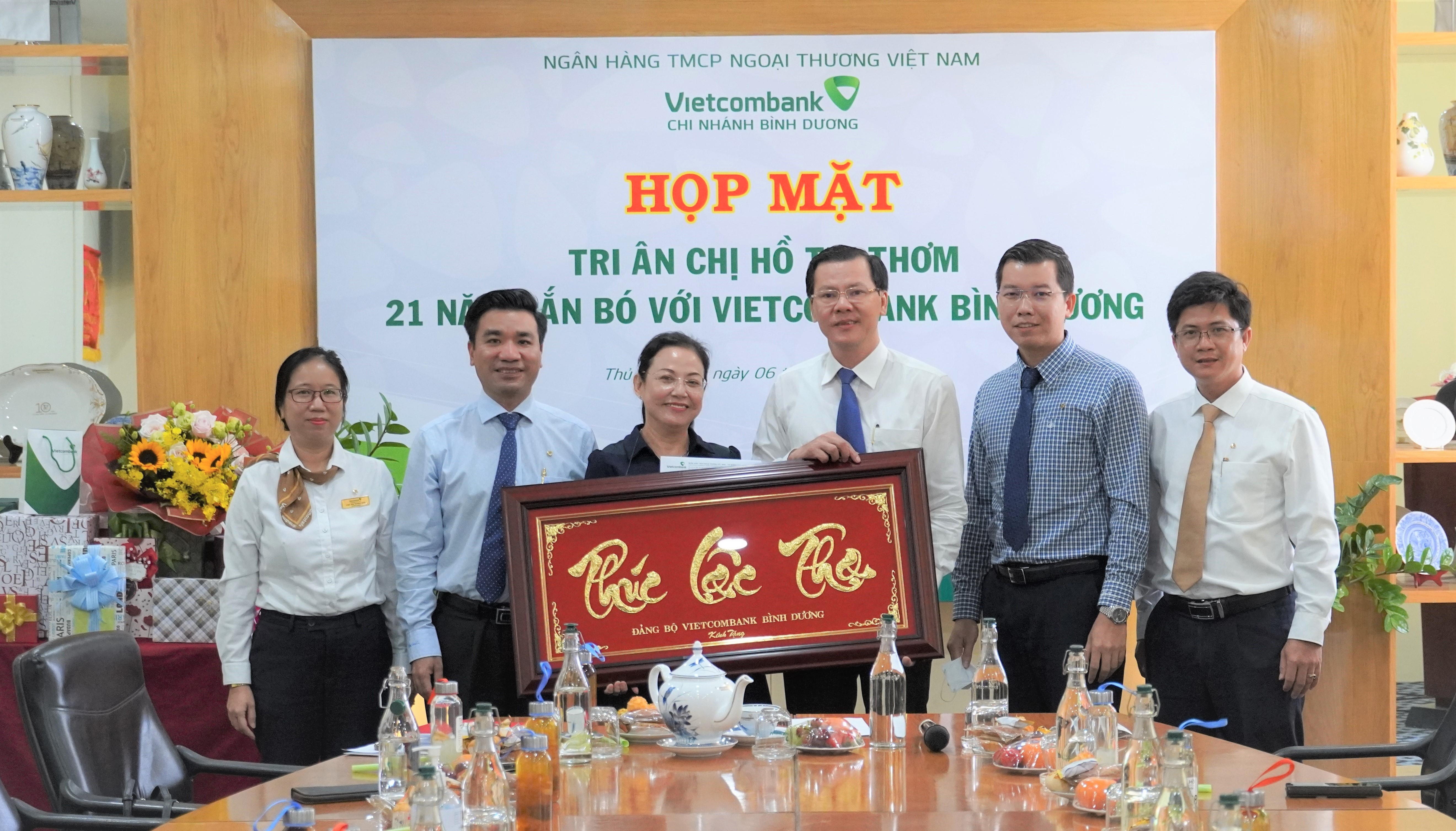 Tại buổi gặp mặt, ông Nguyễn Thái Minh Quang - Bí thư Đảng ủy, Giám đốc Vietcombank Bình Dương đã điểm lại quá trình công tác và những đóng góp của bà Hồ Thị Thơm đối với sự phát triển của Vietcombank nói chung và Vietcombank Bình Dương nói riêng. Trong suốt thời gian hơn 21 năm gắn bó với Vietcombank, với tinh thần trách nhiệm và sự phấn đấu không ngừng, bà Hồ Thị Thơm đã cùng tập thể cán bộ nhân viên của chi nhánh vượt qua khó khăn, thách thức để hoàn thành xuất sắc nhiệm vụ, góp phần đào tạo nên nhiều lớp cán bộ kế cận có năng lực, triển vọng, kinh nghiệm để đảm nhận vị trí lãnh đạo, quản lý trong tương lai. Bằng những tình cảm trân trọng nhất, chi nhánh ghi nhận và cảm ơn những cống hiến của bà Hồ Thị Thơm trong suốt quá trình công tác, đồng thời sẽ tiếp tục duy trì và phát huy những thành quả mà bà Hồ Thị Thơm đã góp công gây dựng. Thay mặt Ban Giám đốc và toàn thể cán bộ chi nhánh, ông Nguyễn Thái Minh Quang chúc bà Hồ Thị Thơm về nghỉ chế độ luôn mạnh khỏe, nhiều niềm vui trong cuộc sống, tiếp tục dõi theo và ủng hộ sự phát triển bền vững của chi nhánh.