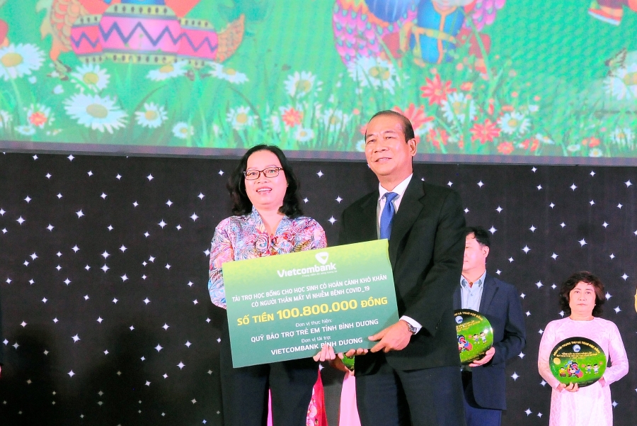 Đại diện Vietcombank Bình Dương, bà Đặng Thị Hương - Phó Bí thư Đảng ủy, Phó Giám đốc Chi nhánh trao biển tượng trưng ủng hộ cho chương trình ngày hội trung thu và trao học bổng cho học sinh, sinh viên nghèo vượt khó, trẻ em có hoàn cảnh khó khăn lần XXI tỉnh Bình Dương năm 2022