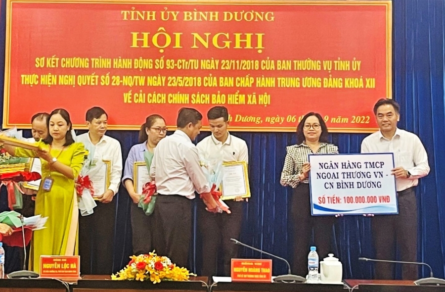 Trước đó vào chiều ngày 06/9/2022, Vietcombank Bình Dương đã tham dự Hội nghị sơ kết Chương trình hành động số 93-CTr/TU ngày 23/11/2018 của Ban Thường vụ Tỉnh ủy thực hiện Nghị quyết số 28-NQ/TW ngày 23/5/2018 của Ban Chấp hành Trung ương Đảng khóa XII về cải cách chính sách bảo hiểm xã hội do Tỉnh ủy Bình Dương tổ chức. Tại Hội nghị, Vietcombank Bình Dương đã trao tặng kinh phí 100 triệu đồng mua sổ Bảo hiểm xã hội, thẻ Bảo hiểm y tế cho người có hoàn cảnh khó khăn trên địa bàn tỉnh, đồng thời vinh dự được Chủ tịch UBND tỉnh Bình Dương tặng Bằng khen do đã có thành tích trong công tác phối hợp và triển khai thực hiện chính sách bảo hiểm xã hội, bảo hiểm thất nghiệp và bảo hiểm y tế trên địa bàn tỉnh trong thời gian qua.
