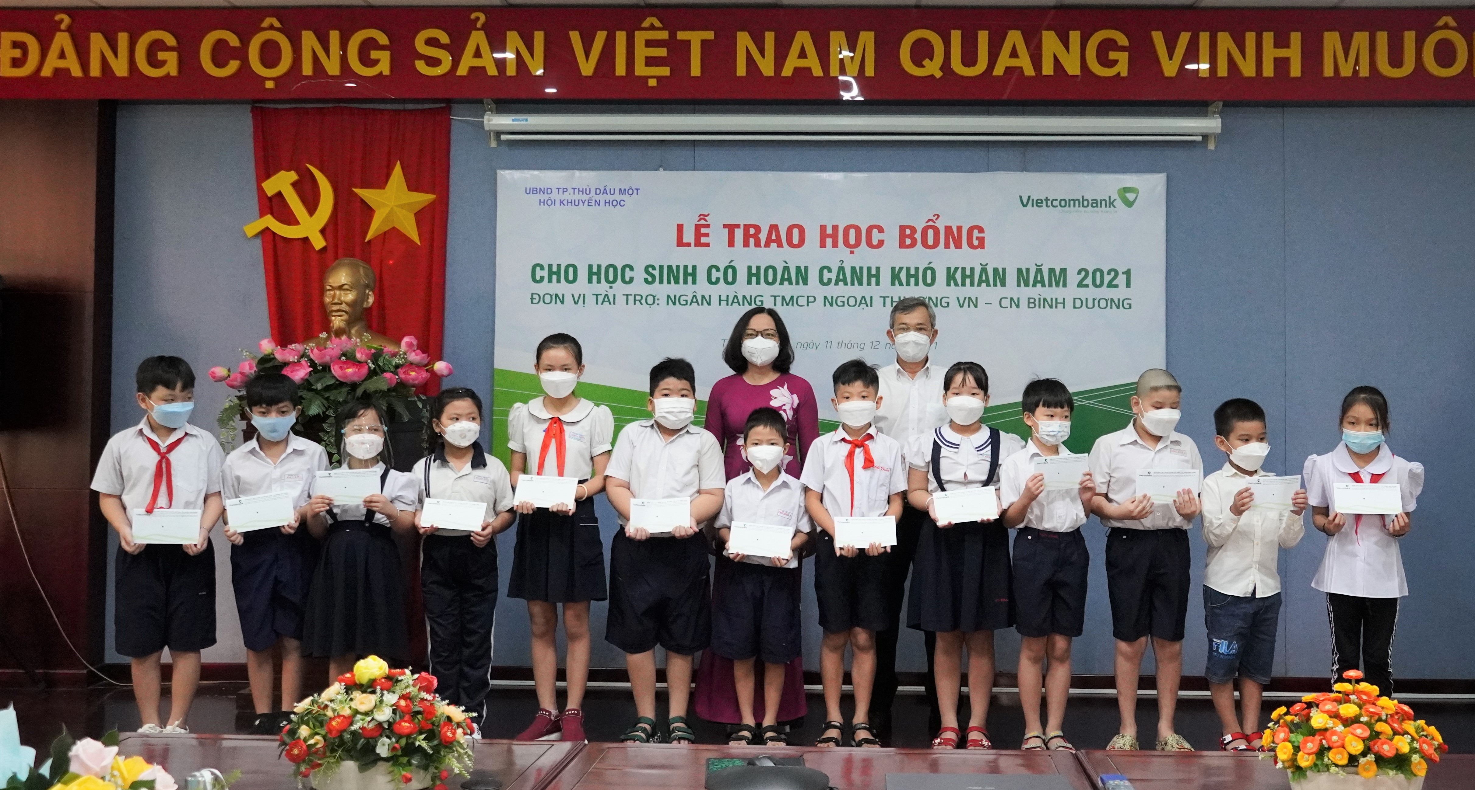 Bà Đặng Thị Hương - Phó Bí thư Đảng ủy, Phó Giám đốc Vietcombank Bình Dương (hàng sau, bên trái) trao học bổng cho các em học sinh nghèo, hiếu học trên địa bàn thành phố Thủ Dầu Một