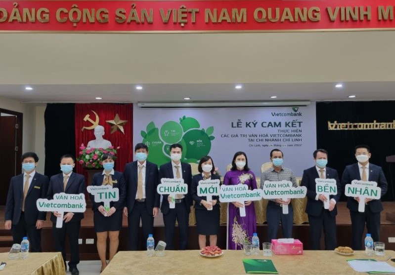 Ban giám đốc, BCH Công đoàn, BCH Chi đoàn thanh niên và các đồng chí Trưởng các phòng trong Chi nhánh Vietcombank Chí Linh tham gia buổi lễ ký cam kết thực hiện giá trị văn hóa Vietcombank
