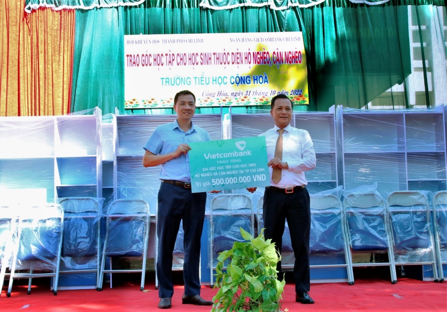 Ngày 31/10/2022, Vietcombank Chí Linh đã trao tặng 500 triệu đồng cho Hội khuyến học thành phố Chí Linh để triển khai thực hiện 334 góc học tập cho các học sinh hộ nghèo, hộ cận nghèo tại 36 điểm trường trên địa bàn thành phố (gồm 17 trường trung học cơ sở và 19 trường tiểu học).
