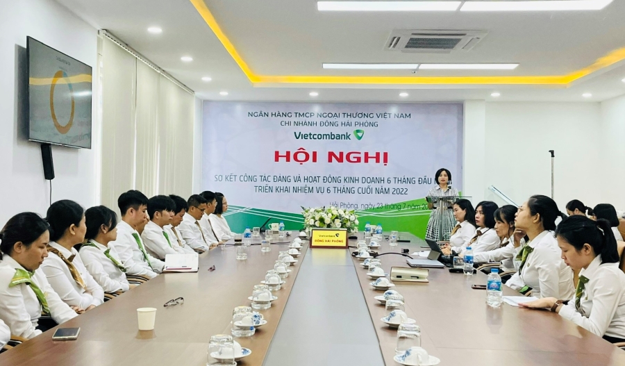 Tại Hội nghị, bà Nguyễn Thị Vân - Bí thư Chi bộ, Giám đốc Vietcombank Đông Hải Phòng đã báo cáo sơ kết công tác Đàng thời gian qua và kết quả hoạt động kinh doanh 6 tháng đầu năm 2022 của Chi nhánh. Trong bối cảnh đại dịch COVID-19 lan rộng toàn cầu, gây thiệt hại lớn trên mọi mặt, bám sát chỉ đạo của Ban lãnh đạo Vietcombank, Ban giám đốc Vietcombanh Đông Hải Phòng đã có những chương trình hành động đúng đắn, kịp thời nhằm thực hiện mục tiêu kép: vừa chống dịch COVID-19, vừa bám sát tình hình thực tiễn để đưa ra các quyết sách đảm bảo tăng trưởng hiệu quả, bền vững. Giám đốc Chi nhánh đã truyền đạt đầy đủ chỉ đạo của Ban lãnh đạo tại thông báo kết luận Hội nghị sơ kết 6 tháng đầu năm 2022 của Vietcombank và đề ra phương hướng thực hiện nhiệm vụ kinh doanh 6 tháng cuối năm. Chi nhánh tiếp tục triển khai kinh doanh theo định hướng: tập trung huy động vốn theo hướng tăng cường huy động vốn giá rẻ, tập trung nguồn lực cho phát triển tín dụng, kiểm soát chặt chẽ chất lượng tín dụng, phấn đấu hoàn thành các chỉ tiêu về thẻ, ngân hàng điện tử, bancas, tiếp tục đẩy mạnh công tác khách hàng làm nền tảng thúc đẩy hoạt động kinh doanh, giữ ổn định và gia tăng thị phần, hoàn thiện chất lượng dịch vụ, cán bộ giao dịch viên tuân thủ nghiêm túc Bộ tiêu chuẩn chất lượng dịch vụ của Vietcombank nhằm phục vụ khách hàng ngày một tốt hơn, nâng cao uy tín và thương hiệu Vietcombank nói chung.