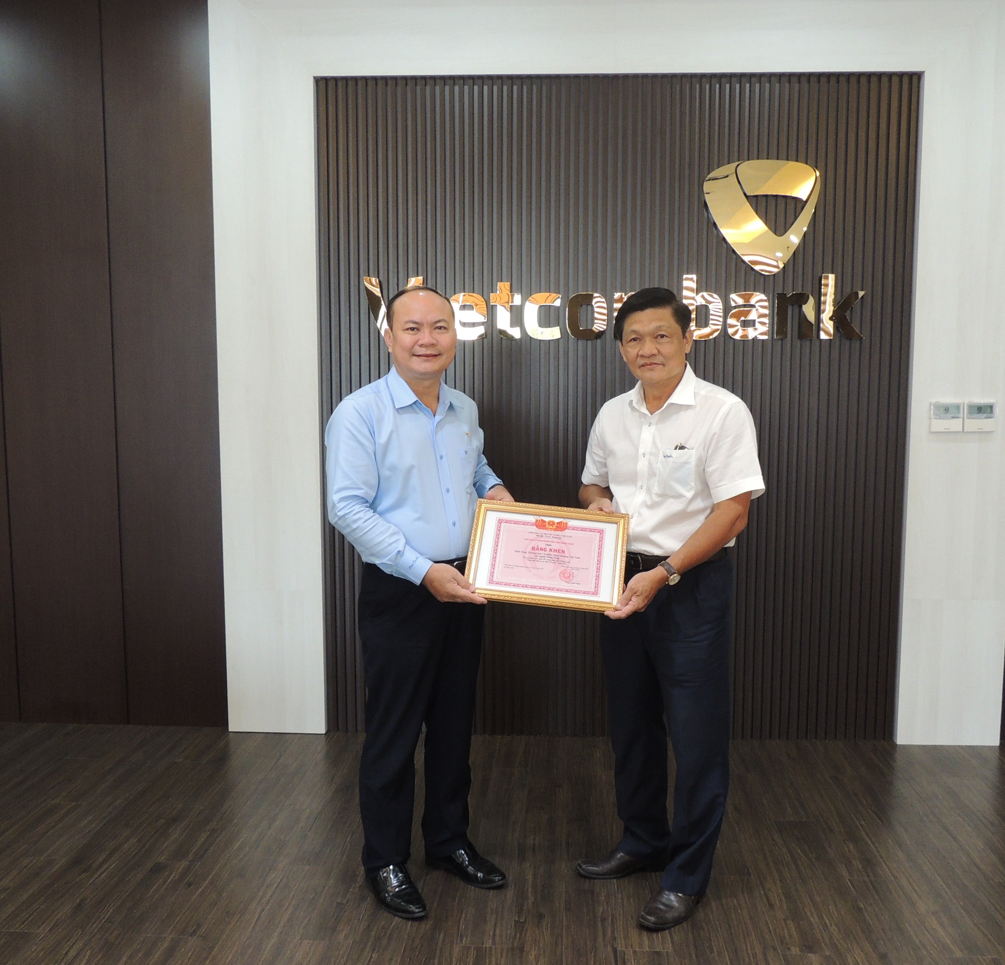 Đại diện Vietcombank Đồng Tháp, ông Phan Duy Phúc - Giám đốc (bên trái) nhận bằng khen của Chủ tịch UBND tỉnh từ Đại tá Phạm Văn Nồng -Trưởng phòng An ninh kinh tế thừa ủy quyền trao tặng