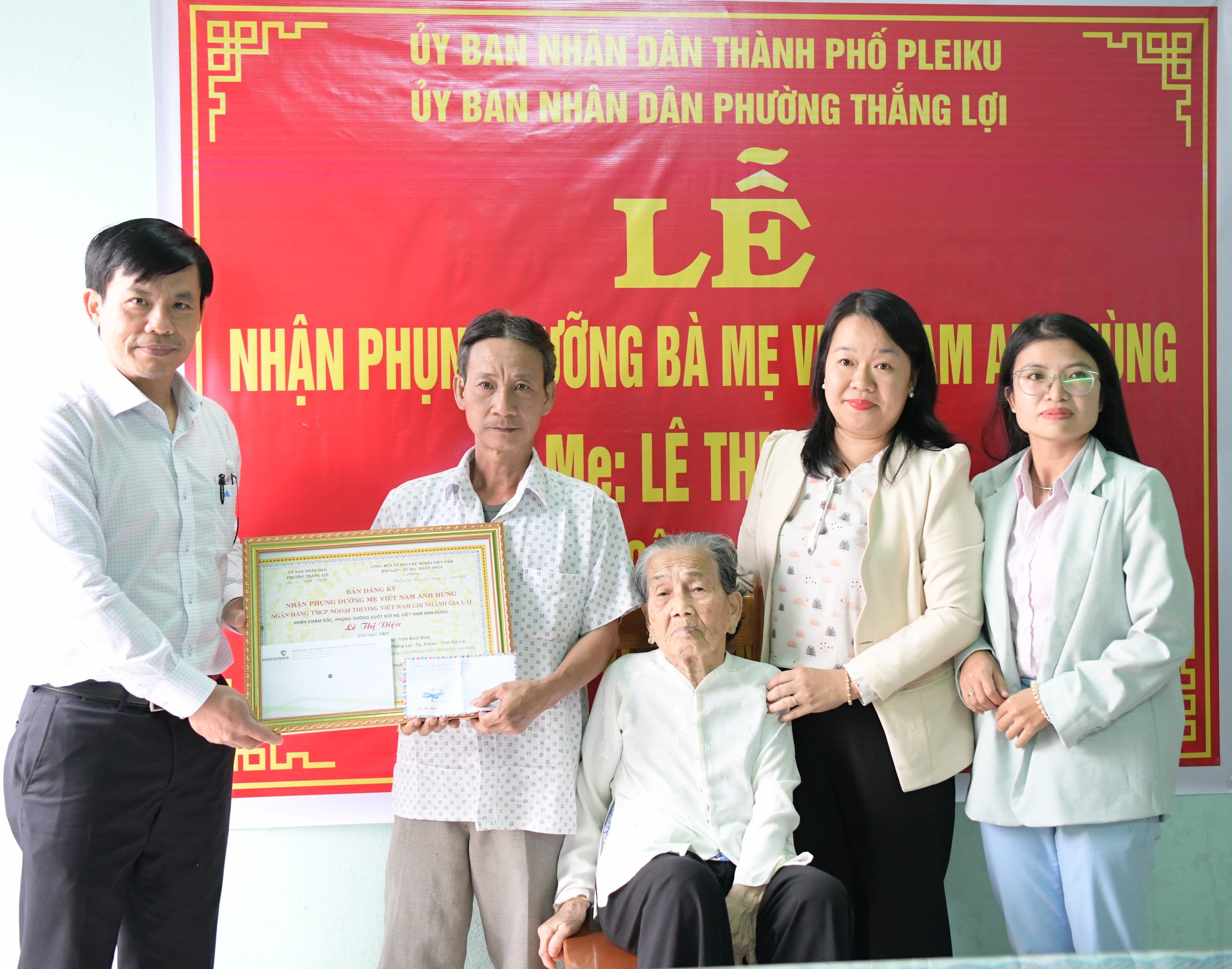 Ông Nguyễn Minh Tuân - Phó Giám đốc, Chủ tịch CĐCS Vietcombank Gia Lai (ngoài cùng bên trái) cùng đại diện chính quyền phường Thắng Lợi, Tp. Pleiku trao phần quà phụng dưỡng cho Mẹ VNAH Lê Thị Diện và người thân