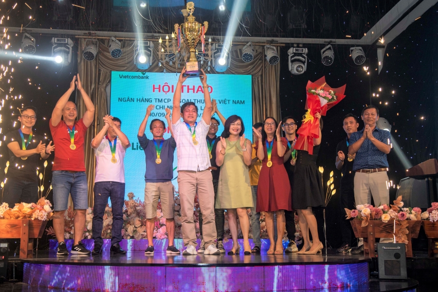 Ông Đặng Văn Sống - Chủ tịch Công đoàn, Phó Giám đốc NHNN chi nhánh tỉnh Gia Lai (ngoài cùng bên phải) và bà Đỗ Thị Việt Hằng - Bí thư Đảng ủy, Giám đốc Vietcombank Gia Lai (thứ 4 từ phải sang) trao huy chương vàng và Cup vô địch môn bóng đá nam cho đội liên quân Phòng KHDN và Quản lý nợ