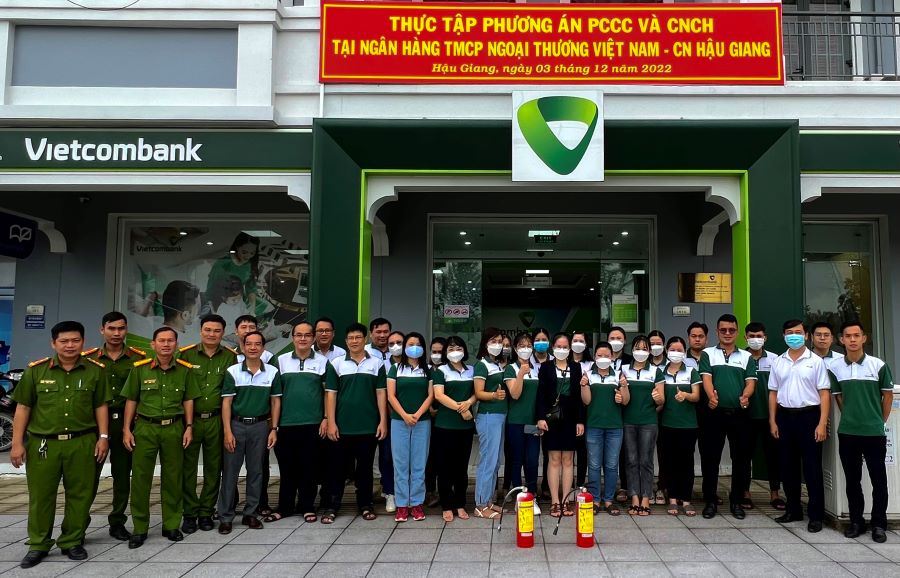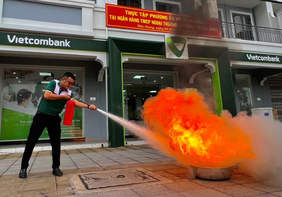 CBNV Vietcombank Hậu Giang diễn tập dập đám cháy bằng bình cứu hỏa