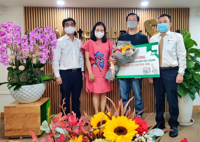 Tại trụ sở chi nhánh, đại diện Vietcombank Hùng Vương, bà Vũ Đại Thắng - Giám đốc chi nhánh đã tặng hoa và trao thưởng cho khách hàng Lâm Minh Việt giải thưởng là xe máy Honda Vision trị giá 30.290.000 VND.