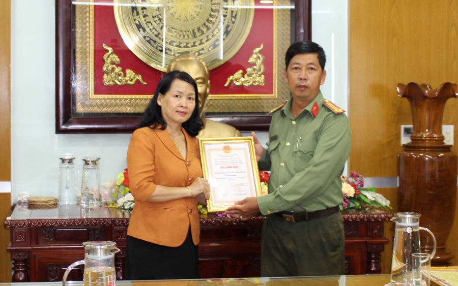 Bà Đỗ Thị Minh Út – Phó Giám đốc Vietcombank Kiên Giang (bên trái) tiếp nhận giấy chứng nhận ngân hàng đạt tiêu chuẩn “An toàn về an ninh, trật tự” năm 2021 do UBND tỉnh Kiên Giang trao tặng