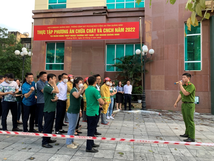 Ngày 22/09/2022, tại trụ sở Vietcombank Quảng Ninh, đường 25/4, phường Bạch Đằng, TP Hạ Long, tỉnh Quảng Ninh, Vietcombank Quảng Ninh phối hợp với Phòng Cảnh sát phòng cháy chữa cháy và cứu nạn cứu hộ (PCCC & CNCH) - Công an tỉnh Quảng Ninh tổ chức thực tập phương án PCCC & CNCH năm 2022.