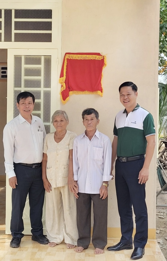 Ông Nguyễn Hoài Phương - Giám đốc Vietcombank Tây Ninh (ngoài cùng bên phải) cùng ông Nguyễn Ngọc Trỗi - Ủy viên BTV huyện ủy, Phó Chủ tịch UBND huyện Tân Biên (ngoài cùng bên trái) thực hiện nghi lễ mở biển trao tặng nhà tình nghĩa cho gia đình ông Hoàng Văn Thắng ở xã Thạnh Tây