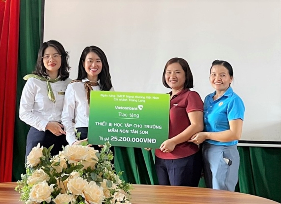 Tại buổi trao tặng, bà Nguyễn Thị Thùy Dương - Trưởng phòng giao dịch Thụy Khuê, Vietcombank Thăng Long đã chia sẻ: Trường mầm non Tân Sơn là một ngôi trường đã có nhiều thành tích trong dạy và học. Cô và trò luôn cùng nhau phấn đấu, nỗ lực, khắc phục mọi khó khăn để đạt được kết quả tốt trong nuôi dưỡng, chăm sóc, giáo dục trẻ, luôn đảm bảo an toàn cho trẻ về mọi mặt. Tuy nhiên, cơ sở vật chất của trường chưa đáp ứng được nhu cầu dạy và học của giáo viên và học sinh. Trước thực tế này, thời gian qua Vietcombank Thăng Long đã phối hợp cùng UBND xã Tân Sơn, tỉnh Phú Thọ thực hiện tài trợ trang thiết bị, cơ sở vật chất phục vụ việc dạy và học cho thầy cô và các em nhỏ tại trường mầm non Tân Sơn với tổng giá trị hơn 25 triệu đồng. Vietcombank Thăng Long hy vọng với những đóng góp nhỏ bé này sẽ góp phần nâng cao cơ sở vật chất cho nhà trường để việc chăm sóc, nuôi dưỡng, giáo dục trẻ được thuận lợi hơn, các em nhỏ có môi trường học tập đầy đủ hơn.