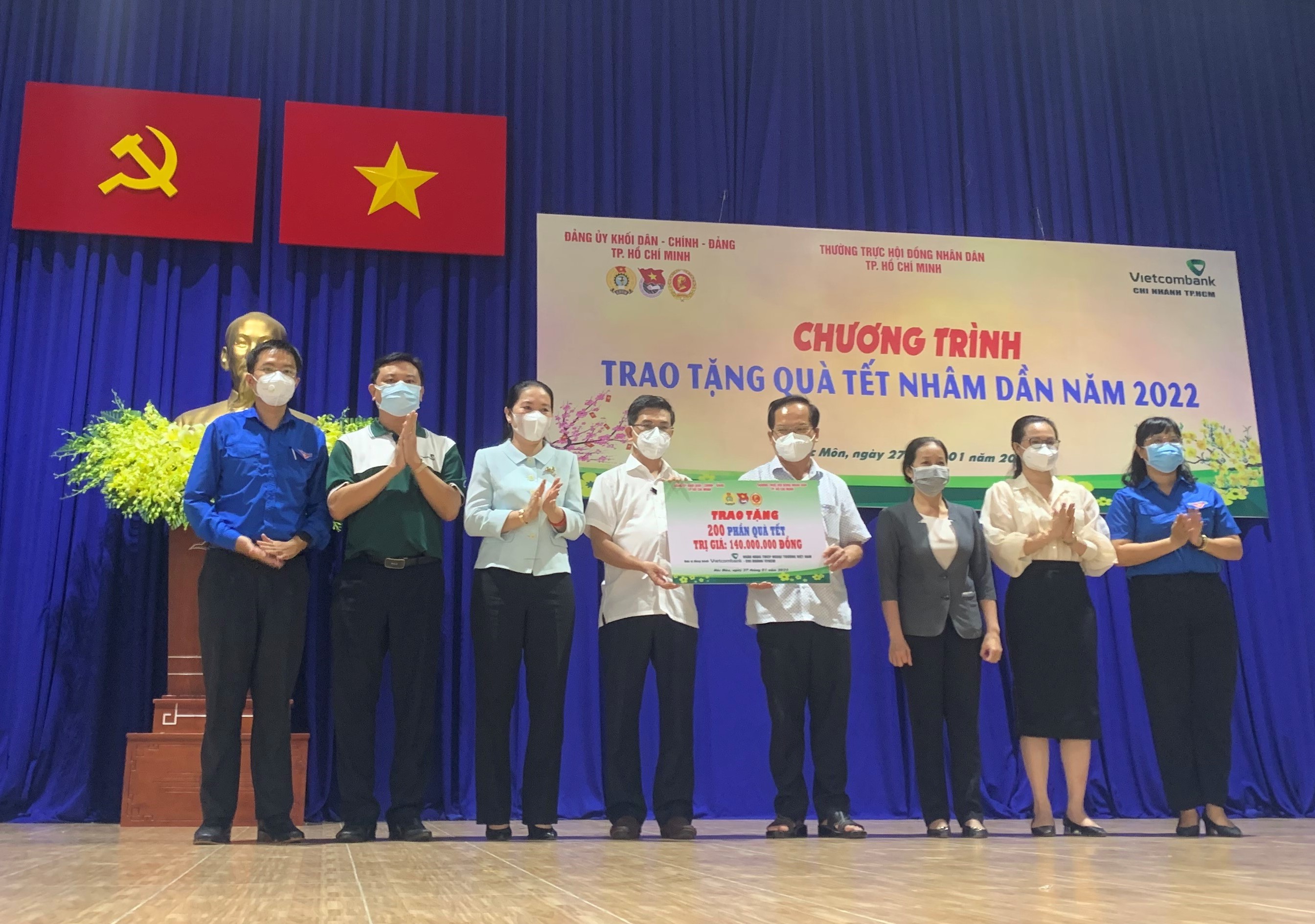 Đại diện Vietcombank Tp HCM cùng các lãnh đạo Thành ủy, HĐND, Đảng ủy khối Dân-Chính-Đảng trao biểu trưng cho đại diện các huyện Củ Chi, Hóc Môn và Bình Chánh
