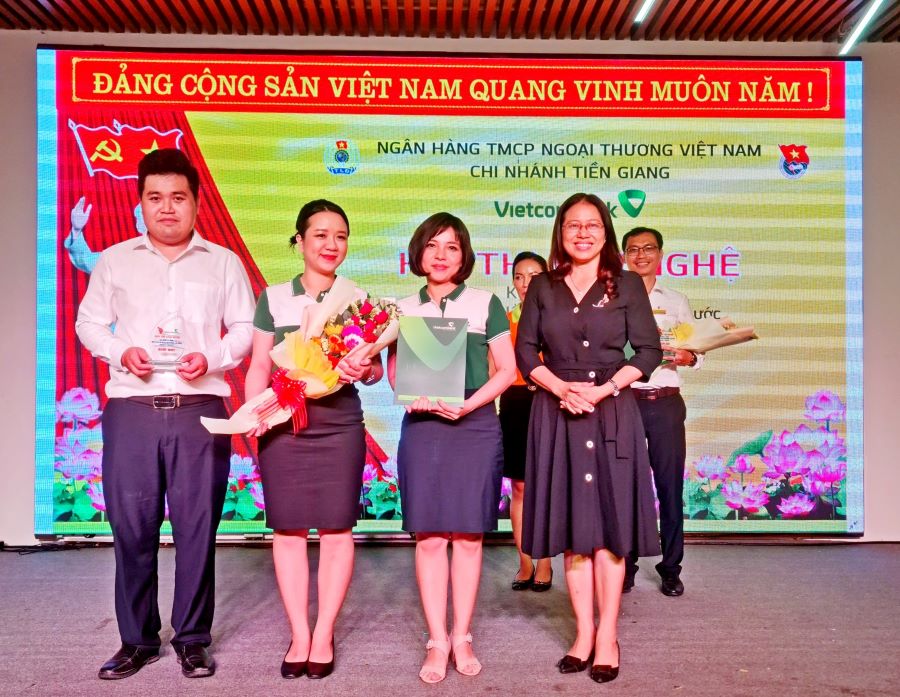 Bà Nguyễn Thị Tuyết - Bí thư Chi bộ, Giám đốc Vietcombank Tiền Giang (ngoài cùng bên phải) trao thưởng cho đội đạt giải Nhì