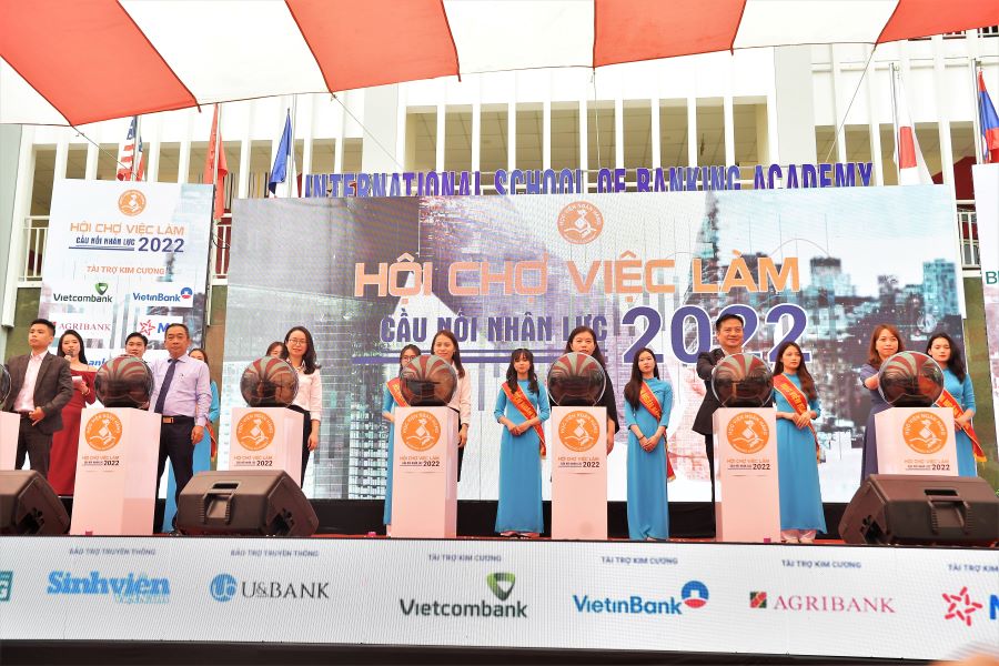 Cái đại biểu tham dự nghi thức khởi động chương trình Hội chợ việc làm 2022 (đại diện của Vietcombank đứng ngoài cùng bên phải)