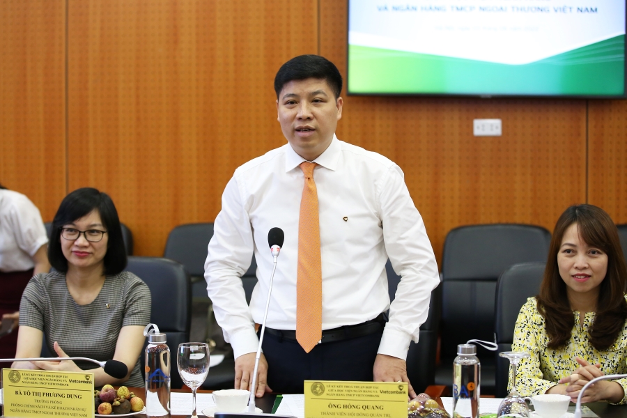 Phát biểu tại Lễ ký kết, ông Hồng Quang - Thành viên HĐQT, Giám đốc Khối nhân sự Vietcombank nhấn mạnh: Học viện Ngân hàng là cơ sở đào tạo uy tín, đóng góp rất lớn về nguồn nhân lực cho ngành ngân hàng nói chung và Vietcombank nói riêng. Từ ngôi trường này rất nhiều thế hệ sinh viên, học viên đã trở thành những cán bộ lãnh đạo, quản lý chủ chốt của nghành ngân hàng và của Vietcombank. Là ngân hàng có truyền thống lâu đời với gần 60 năm xây dựng và phát triển, Vietcombank luôn quan tâm đến công tác đào tạo, phát triển nguồn nhân lực, trong đó văn hoá học tập, sáng tạo, sẵn sàng đổi mới là những giá trị cốt lõi của ngân hàng và hiện đang thực hiện mục tiêu xây dựng Vietcombank thành tổ chức học tập sáng tạo, phấn đấu đến năm 2025 trở thành ngân hàng đứng đầu Việt Nam về chất lượng nguồn nhân lực. Trong thời gian qua, Vietcombank đã triển khai nhiều hoạt động hợp tác với các trường đại học trên cả nước, trong đó có Học viện Ngân hàng. Ông Hồng Quang tin tưởng, hợp tác giữa Vietcombank và Học viện Ngân hàng sẽ tiếp tục có sự gắn kết chặt chẽ, toàn diện, hiệu quả, góp phần khẳng định vị thế của hai đơn vị, đóng góp vào sự phát triển chung của ngành ngân hàng và của đất nước trong giai đoạn hội nhập quốc tế đang diễn ra ngày càng sâu rộng