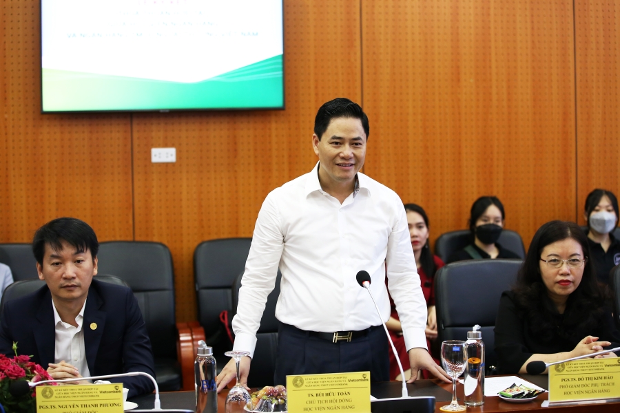 Phát biểu tại buổi lễ ký kết, Tiến sỹ Bùi Hữu Toàn – Bí thư Đảng ủy, Chủ tịch Hội đồng Học viện Ngân hàng khẳng định: Quan hệ hợp tác giữa Học viện Ngân hàng và Vietcombank đã được xây dựng từ những năm 2005-2007. Trong nhiều năm qua, Vietcombank luôn đồng hành, hợp tác cùng Học viện ngân hàng trên nhiều lĩnh vực như đào tạo, nghiên cứu khoa học, tài trợ thiết bị phục vụ công tác giảng dạy, học tập, tài trợ học bổng cho sinh viên….Trong thời gian tới, Học viện Ngân hàng mong muốn mối quan hệ hợp tác sẽ ngày càng phát triển sâu rộng hơn nhằm thực hiện các mục tiêu phát triển của cả hai bên.