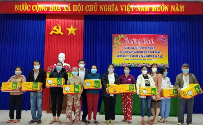 Tiếp tục chuỗi chương trình “Tết yêu thương”, sáng ngày 19/1/2022, Vietcombank Quảng Ngãi đã thực hiện trao 40 suất quà cho các hộ nghèo, hộ có hoàn cảnh đặc biệt khó khăn trên địa bàn phường Trần Phú - Tp.Quảng Ngãi. Mỗi suất quà trị giá 500 ngàn đồng gồm 1 thùng bánh Tết và 300 ngàn đồng tiền mặt.