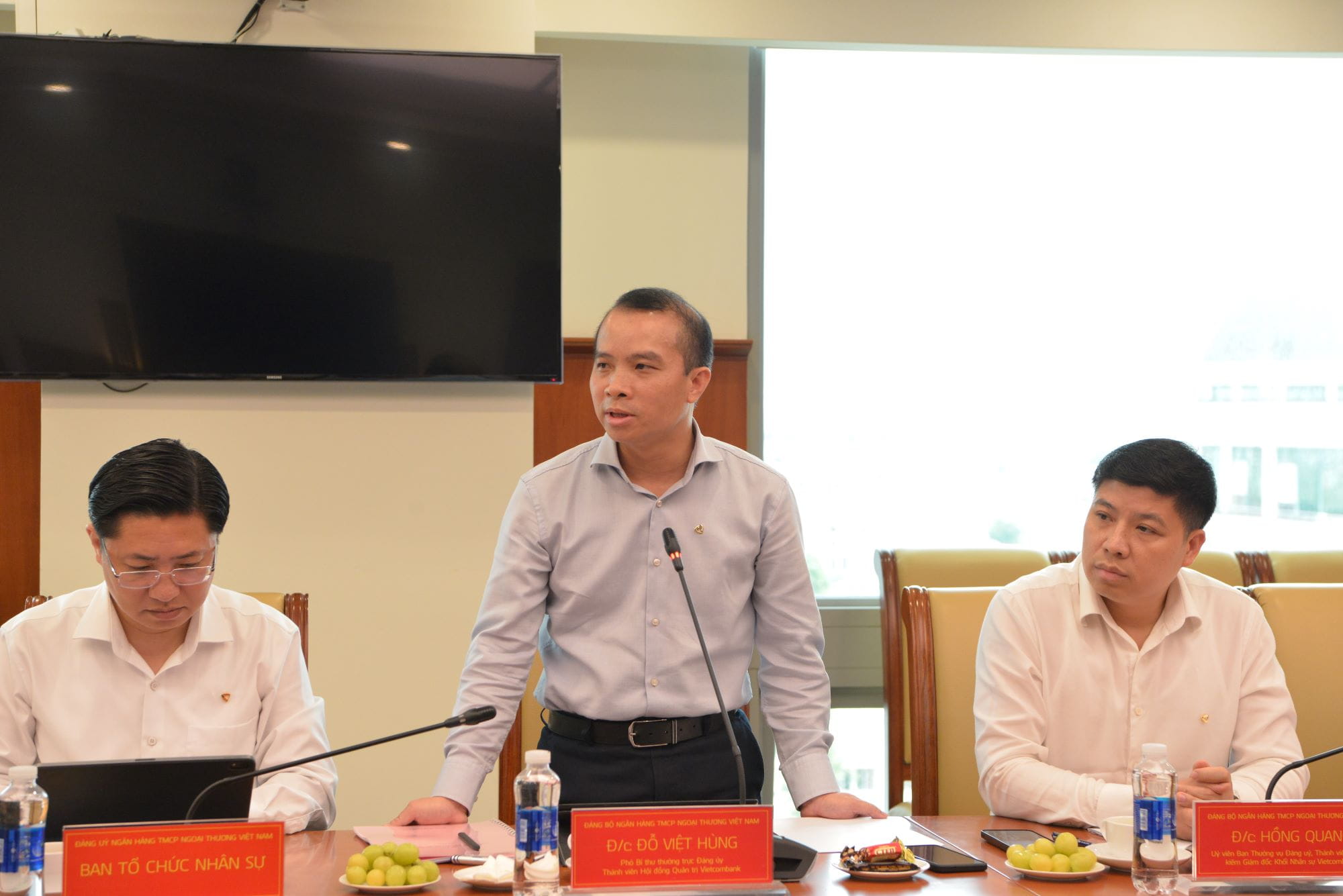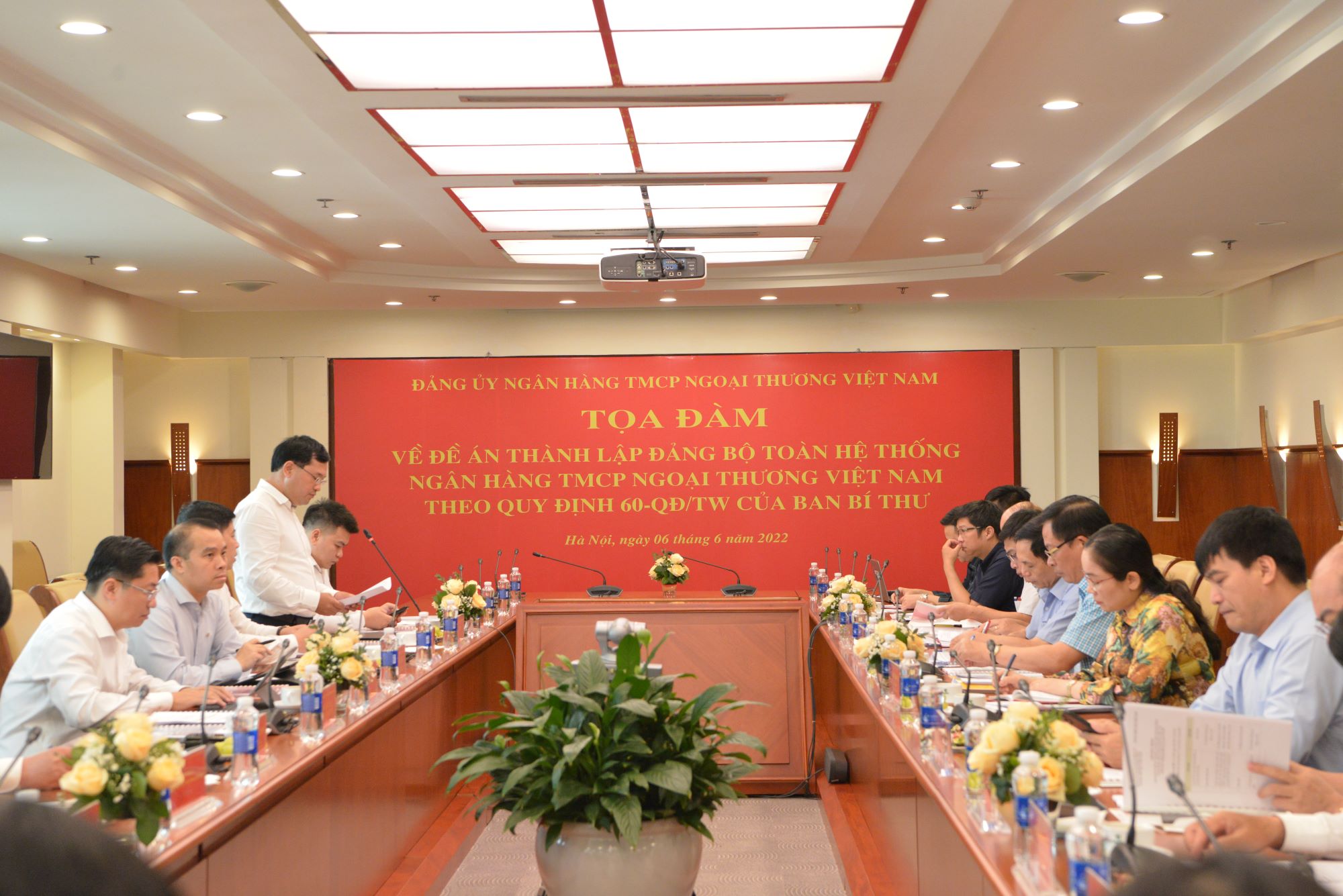 Đại diện Đảng ủy Vietcombank, đ/c Hồng Quang - Ủy viên Ban thường vụ Đảng ủy, Thành viên HĐQT, Giám đốc khối nhân sự, Chủ tịch Công đoàn trình bày Đề án thành lập Đảng bộ toàn hệ thống Ngân hàng TMCP Ngoại thương Việt Nam theo Quy định 60-QĐ/TW của Ban Bí thư