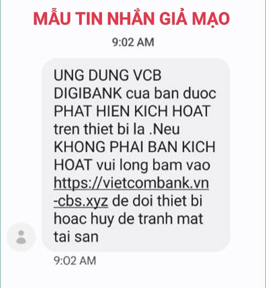 Đây là thủ đoạn không mới, đã được ngân hàng và các cơ quan báo chí liên tục cảnh báo trong nhiều năm qua. Tuy nhiên, các đối tượng thường xuyên thay đổi nội dung tin nhắn SMS giả mạo để thực hiện hành vi lừa đảo. Vietcombank vẫn đang tích cực phối hợp với các Cơ quan Chức năng để ngăn chặn các đường link giả mạo, hạn chế tối đa các rủi ro, thiệt hại về tài chính cho khách hàng.S