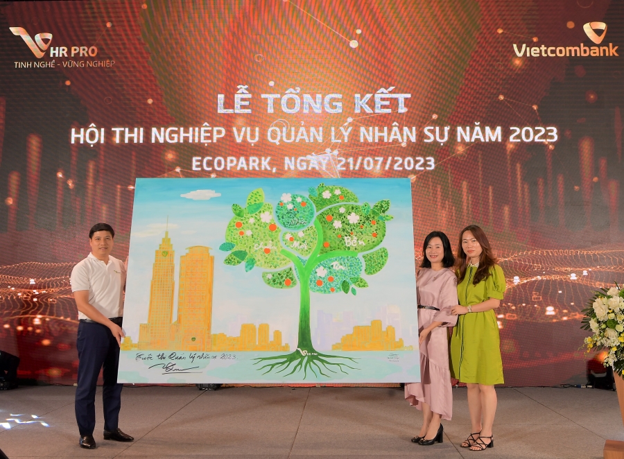 Ông Hồng Quang - Thành viên HĐQT kiêm Giám đốc Khối nhân sự, Trưởng Ban tổ chức Hội thi trao tặng Trường Đào tạo & PTNNL Vietcombank bức tranh Cây văn hóa Vietcombank được vẽ bằng vân tay của Ban lãnh đạo và của các cán bộ tham gia Hội thi