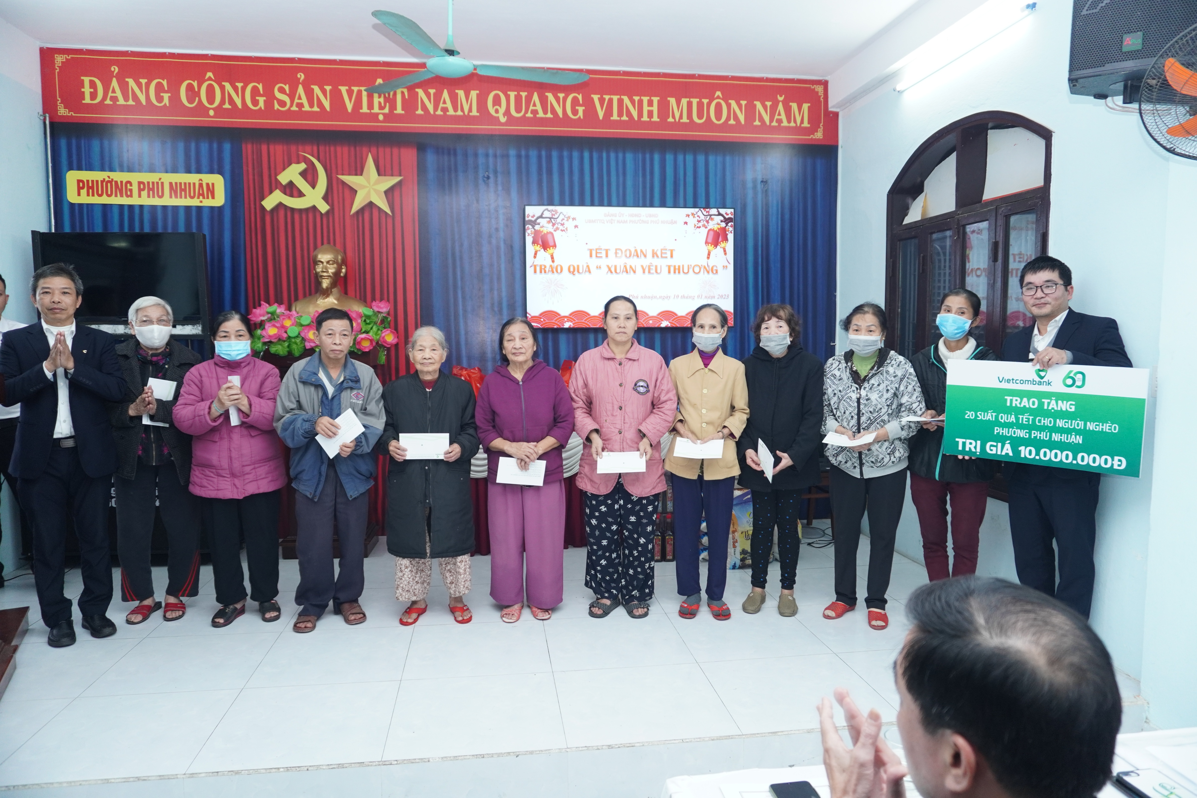 Đại diện Công đoàn cơ sở Vietcombank Huế tặng 20 suất quà Tết cho người nghèo tại phường Phú Nhuận, thành phố Huế, tỉnh Thừa Thiên Huế.