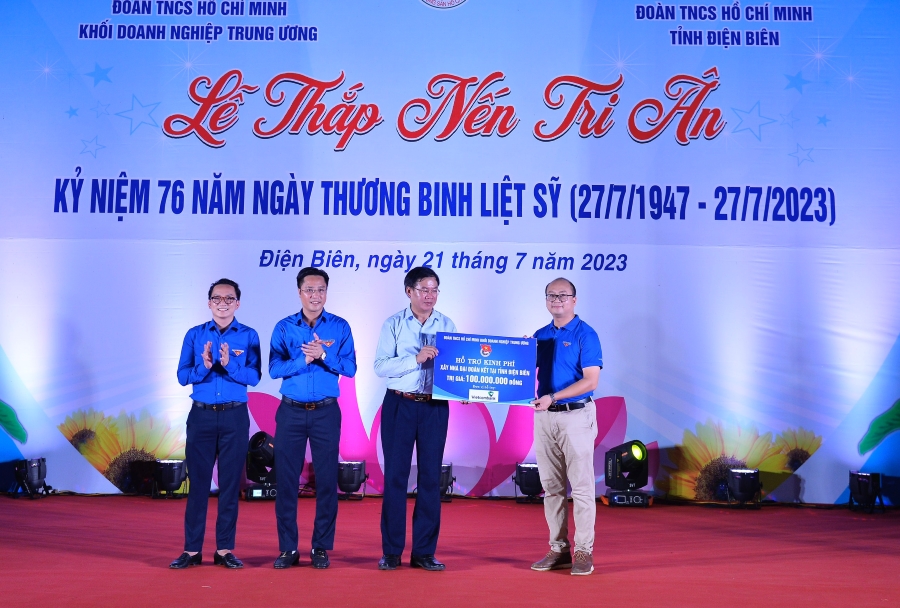 Tại buổi lễ, đ/c Dương Bảo Trung đã đại diện Đoàn Thanh niên Vietcombank tiến hành trao biển hỗ trợ kinh phí xây dựng 2 ngôi nhà Đại đoàn kết tại tỉnh Điện Biên với số tiền trị giá 100 triệu đồng. Đây là nguồn kinh phí do trực tiếp các đoàn viên, thanh niên trong hệ thống đóng góp ủng hộ.