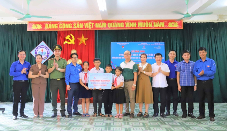 Đồng chí Dương Bảo Trung - Bí thư ĐTN Vietcombank phối hợp cùng Đoàn PVN trao tặng 01 bể bơi di động cho thiếu nhi