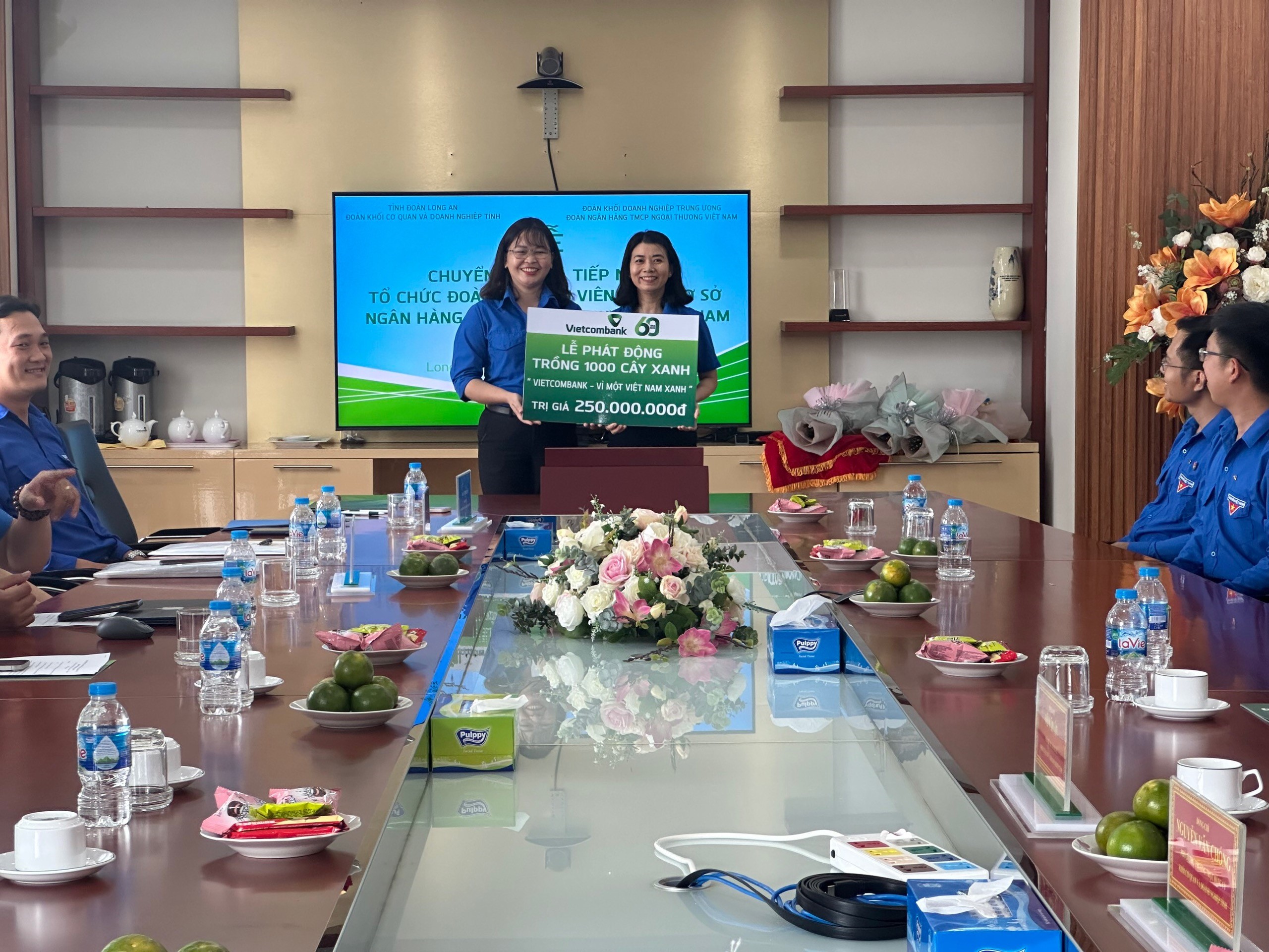 Tại buổi lễ, Đoàn Thanh niên Vietcombank Long An đã trao bảng tượng trưng thực hiện công trình “Vì một Việt Nam Xanh” với 1.000 cây xanh, trị giá 250 triệu đồng cho Đoàn Khối cơ quan và doanh nghiệp tỉnh Long An.