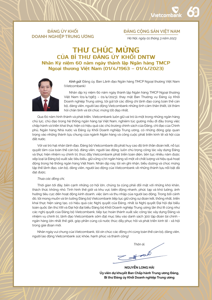 Nhân dịp Ngân hàng TMCP Ngoại thương Việt Nam (Vietcombank) kỷ niệm 60 năm thành lập, đồng chí Nguyễn Long Hải - Bí thư Đảng ủy Khối DNTW đã gửi Thư chúc mừng tới toàn thể cán bộ, nhân viên Vietcombank.