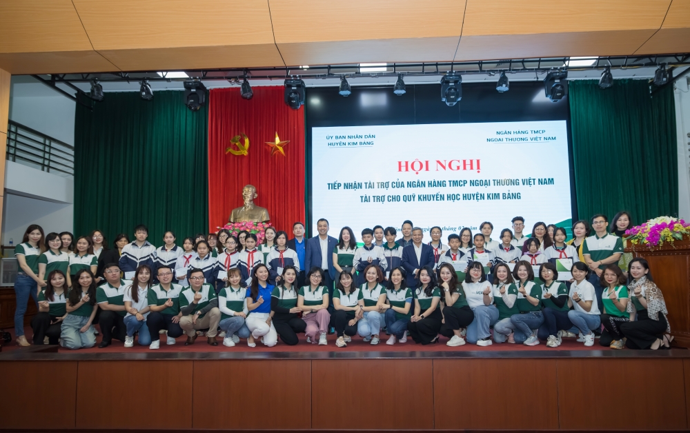 Lãnh đạo, cán bộ Trung tâm hỗ trợ khách hàng Vietcombank cùng Chi nhánh Hà Nam chụp ảnh lưu niệm với các đ/c lãnh đạo huyện Kim Bảng và các em học sinh