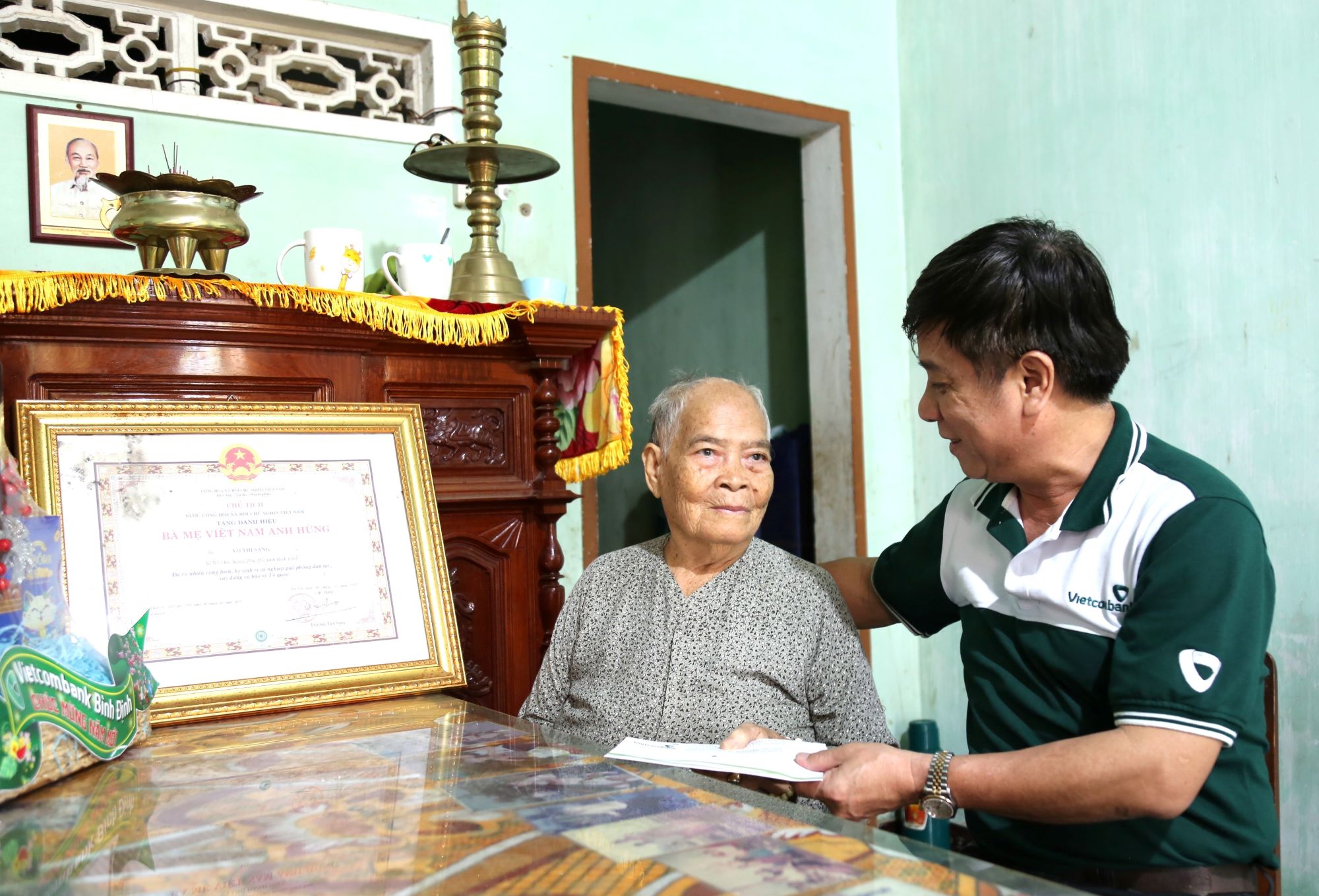 Ông Nguyễn Tấn Chúc - Phó chủ tịch thường trực CĐCS Vietcombank Bình Định thăm và tặng quà Mẹ VNAH Võ Thị Sang