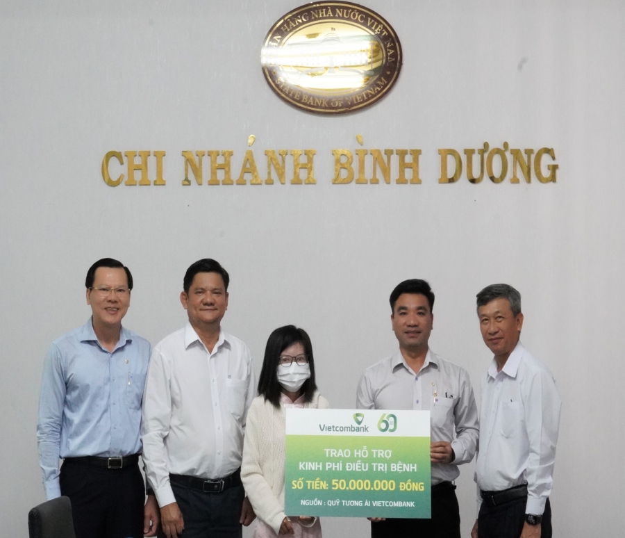 Ông Nguyễn Thái Minh Quang - Bí thư Đảng uỷ, Giám đốc Vietcombank Bình Dương, Ủy viên Ban Chấp hành Công đoàn Vietcombank (ngoài cùng bên trái) cùng Ban Giám đốc NHNN tỉnh và đại diện Công đoàn Vietcombank Bình Dương trao biển tượng trưng hỗ trợ kinh phí điều trị bệnh cho bà Chế Huyền Nhung