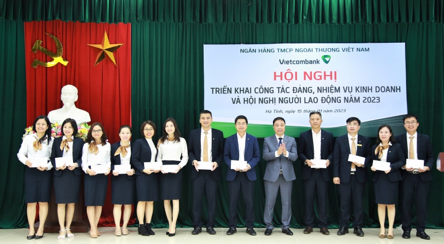 Ông Phan Viết Phong - Bí thư Đảng ủy, Giám đốc Vietcombank Hà Tĩnh (thứ 5 từ trái sang) trao khen thưởng cho các tập thể xuất sắc năm 2022