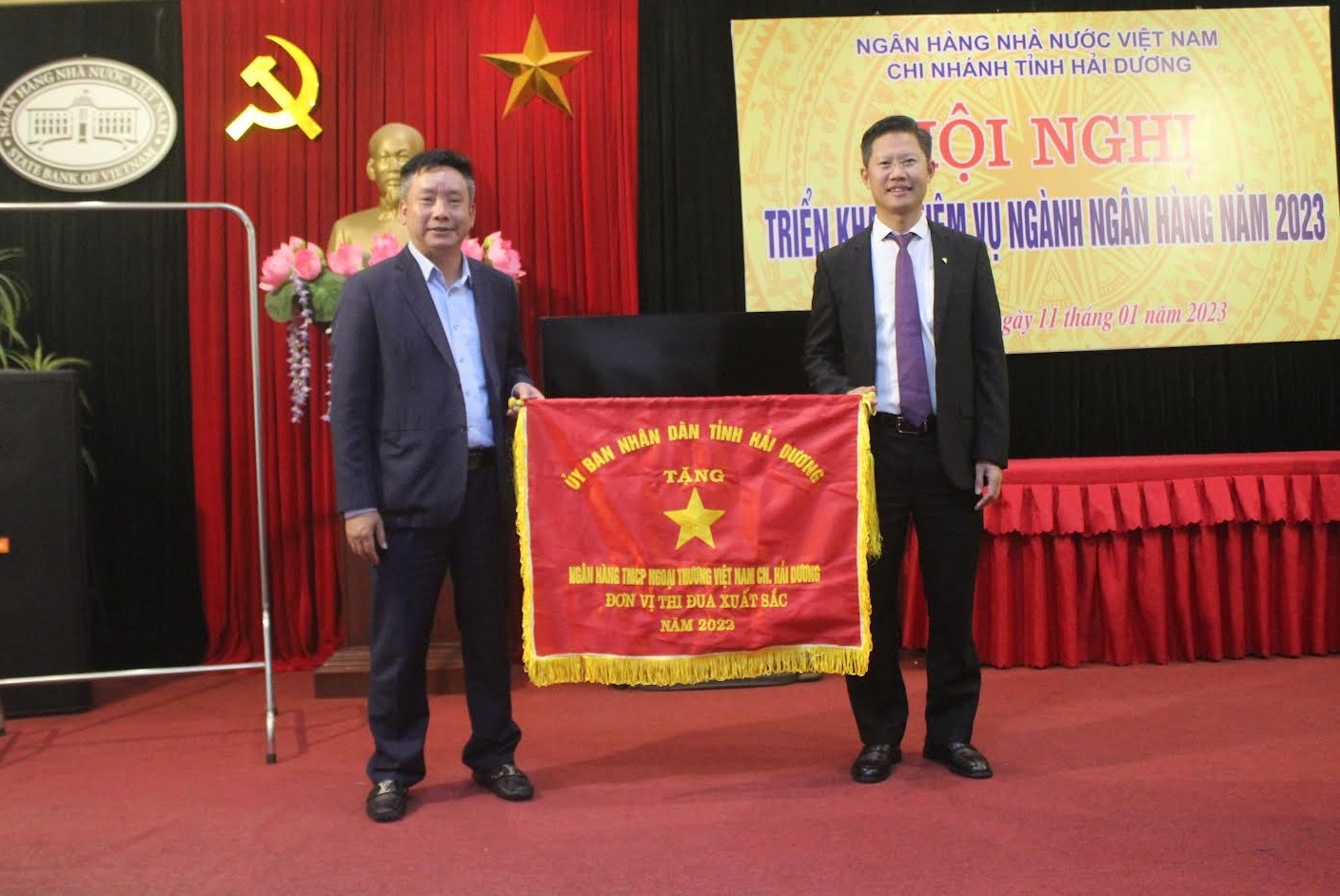 Đại diện Vietcombank Hải Dương, ông Nguyễn Xuân Cao Cường - Giám đốc Chi nhánh nhận cờ thi đua xuất sắc từ lãnh đạo tỉnh Hải Dương