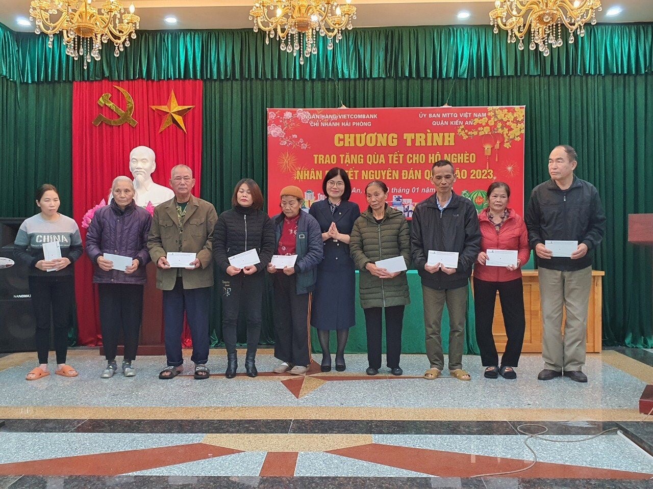 Cụ thể, Công đoàn - Đoàn thanh niên Vietcombank Hải Phòng đã trực tiếp trao tặng các suất quà tại 10 quận huyện phường xã trên địa bàn thành phố, tổng số là 300 suất quà tết trị giá 150 triệu đồng cho các hộ nghèo huyện Vĩnh Bảo, quận Kiến An, các phường: Đằng Giang, Cầu Đất, Niệm Nghĩa, Trại Cau, Quán Toan, Đông Hải 2, Đông Khê và huyện An Lão. Đây là nguồn động viên các hộ gia đình còn gặp nhiều khó khăn trong cuộc sống đón Tết thêm vui tươi, phấn khởi và cũng là hành động thiết thực nhằm phát huy truyền thống đoàn kết, tinh thần tương thân tương ái, lá lành đùm lá rách của Vietcombank Hải Phòng nói riêng và người dân thành phố Hải Phòng nói chung.