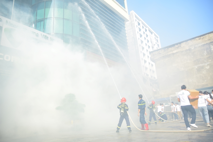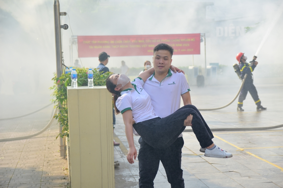 Tình huống giả định, xuất hiện đám cháy tại khu giao dịch tầng 1. Đây là khu vực tập trung đông người đến giao dịch và liên hệ làm việc. Sau khi phát hiện đám cháy, lực lượng chữa cháy tại chỗ đã nhanh chóng điện cho số điện thoại 114 để báo vụ việc, đồng thời tại hiện trường toàn bộ nhân viên ngân hàng đã nhanh chóng di chuyển nạn nhân, tài sản ra khu vực an toàn; tiến hành các hoạt động chữa cháy tại chỗ chờ lực lượng phòng cháy, chữa cháy chuyên nghiệp tới hỗ trợ.