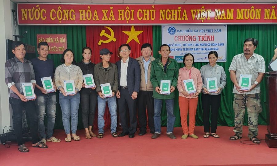 Tại tỉnh Quảng Ngãi, Vietcombank Quảng Ngãi đã phối hợp cùng với BHXH tỉnh tiến hành trao tặng 150 sổ BHXH tự nguyện và 200 thẻ BHYT với tổng giá trị là 267,3 triệu đồng tại các huyện Trà Bồng, Bình Sơn, Nghĩa Hành, Mộ Đức, Đức Phổ, Sơn Tịnh, Tư Nghĩa, Ba Tơ, Tp Quảng Ngãi trong thời gian từ ngày 27/12 đến ngày 29/12/2022. Đối tượng tặng sổ BHXH và thẻ BHYT là người có hoàn cảnh khó khăn.