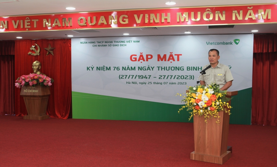 Phát biểu tại buổi lễ, ông Hồ Văn Tuấn - Giám đốc Vietcombank Sở giao dịch chia sẻ: trong nhiều năm qua, chi nhánh đã làm tốt công tác đền ơn đáp nghĩa với nhiều hoạt động ý nghĩa như tổ chức đoàn cán bộ dâng hương tại các nghĩa trang liệt sỹ, trao tặng nhà tình nghĩa, tặng quà các gia đình chính sách, người có công, tổ chức gặp mặt con em thương bệnh binh là cán bộ tại chi nhánh. Trong dịp kỷ niệm 27/7 năm nay, Vietcombank Sở giao dịch đã tham gia nhiều hoạt động ý nghĩa như đóng góp thiết thực vào các Quỹ Đền ơn đáp nghĩa, thăm hỏi, tặng quà tri ân nhiều gia đình thương binh, liệt sỹ, người có công trên cả nước với tổng số tiền hơn 300 triệu đồng. Đối với các cán bộ là con em của các thương bệnh binh, gia đình liệt sỹ, Ban Giám đốc Vietcombank Sở giao dịch luôn động viên hỗ trợ, tạo điều kiện để các đồng chí chăm lo cho cuộc sống gia đình, giúp các đồng chí yên tâm công tác. Vietcombank Sở giao dịch đã gửi tới các cán bộ con em các thương bệnh binh, liệt sỹ món quà nhỏ như lời tri ân sâu sắc tới các gia đình nhân kỷ niệm ngày Thương binh Liệt sỹ 27/07.