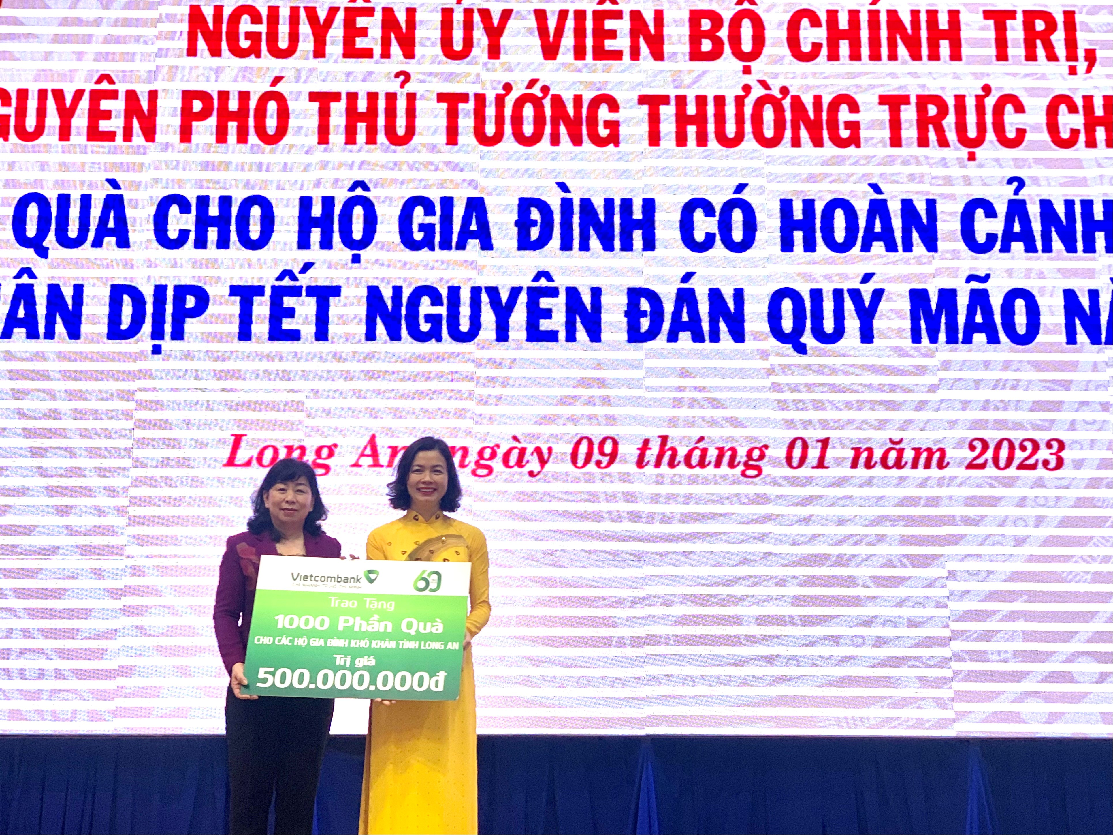 Trong không khí cả nước chuẩn bị đón Tết cổ truyền của dân tộc - Xuân Quý Mão 2023, với mong muốn mang đến một mùa Xuân ấm áp, một cái Tết ý nghĩa và nhiều niềm vui cho những gia đình còn khó khăn, ngày 09/01/2023, Vietcombank TP. Hồ Chí Minh đã trao tặng 1.000 phần quà Tết với tổng trị giá 500 triệu đồng cho các hộ gia đình có hoàn cảnh khó khăn tại tỉnh Long An.