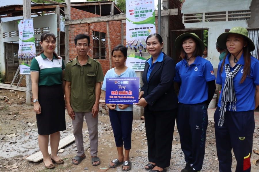 Đại diện Vietcombank Trà Vinh, Trường Đại học Trà Vinh và 2 tuyển thủ bóng đá Việt Nam trao tặng nhà nhân ái cho em Giang Thị Huỳnh Như.