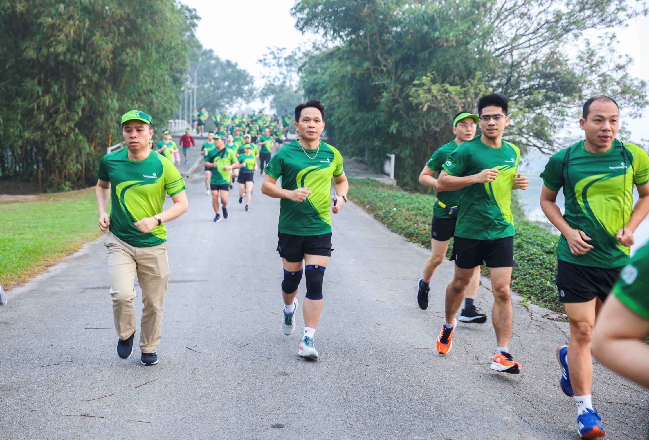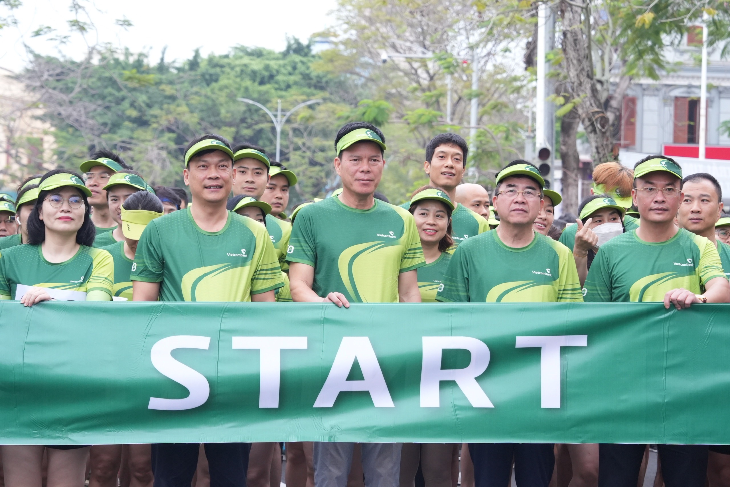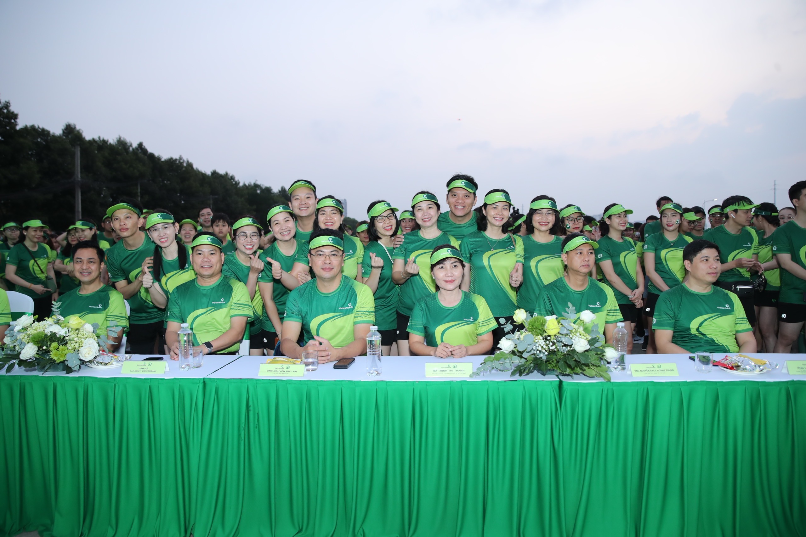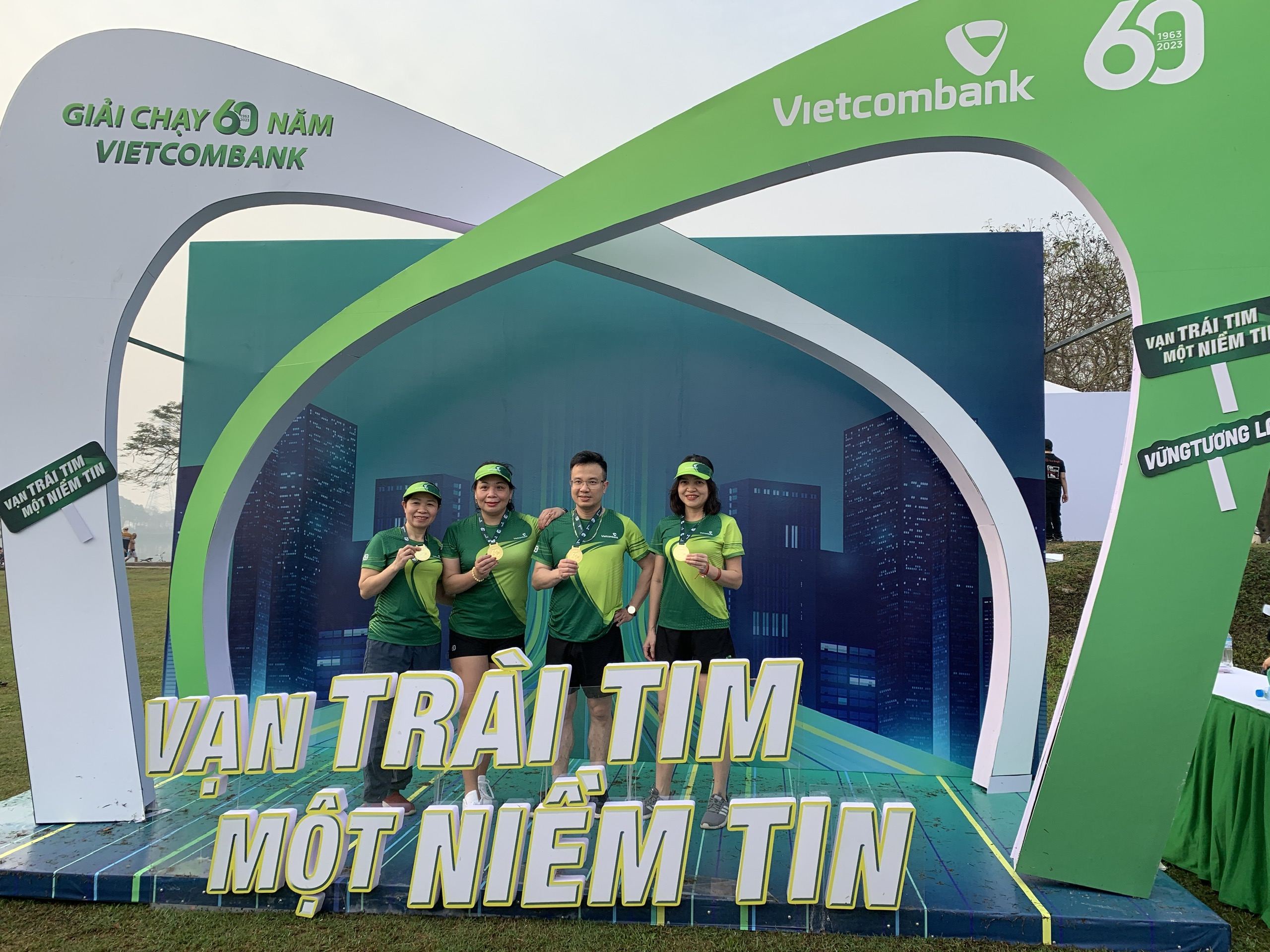 Ban lãnh đạo cùng hơn 3.000  vận động viên là cán bộ, người thân và khách hàng của Vietcombank tại điểm cầu Hà Nội  tham gia giải chạy 60 năm Vietcombank “Vạn trái tim - Một niềm tin” đóng góp cho Quỹ “Vững tương lai”