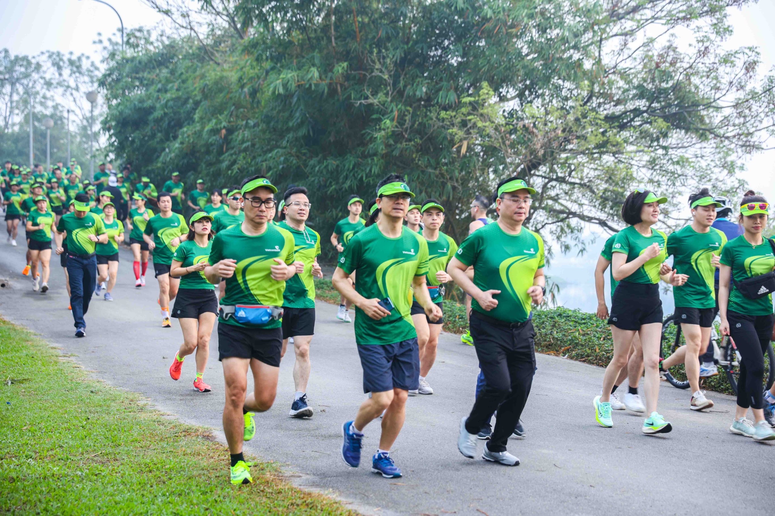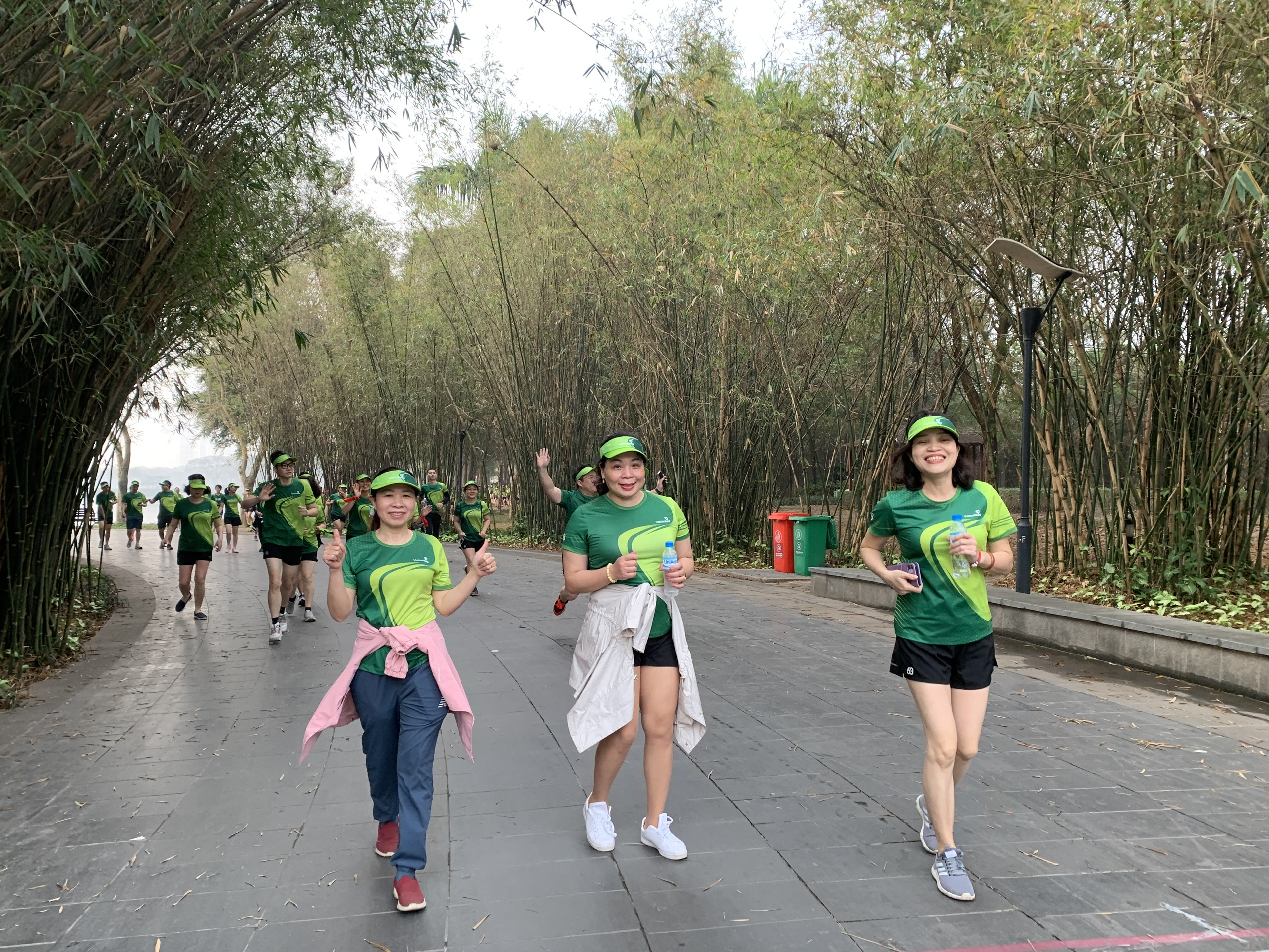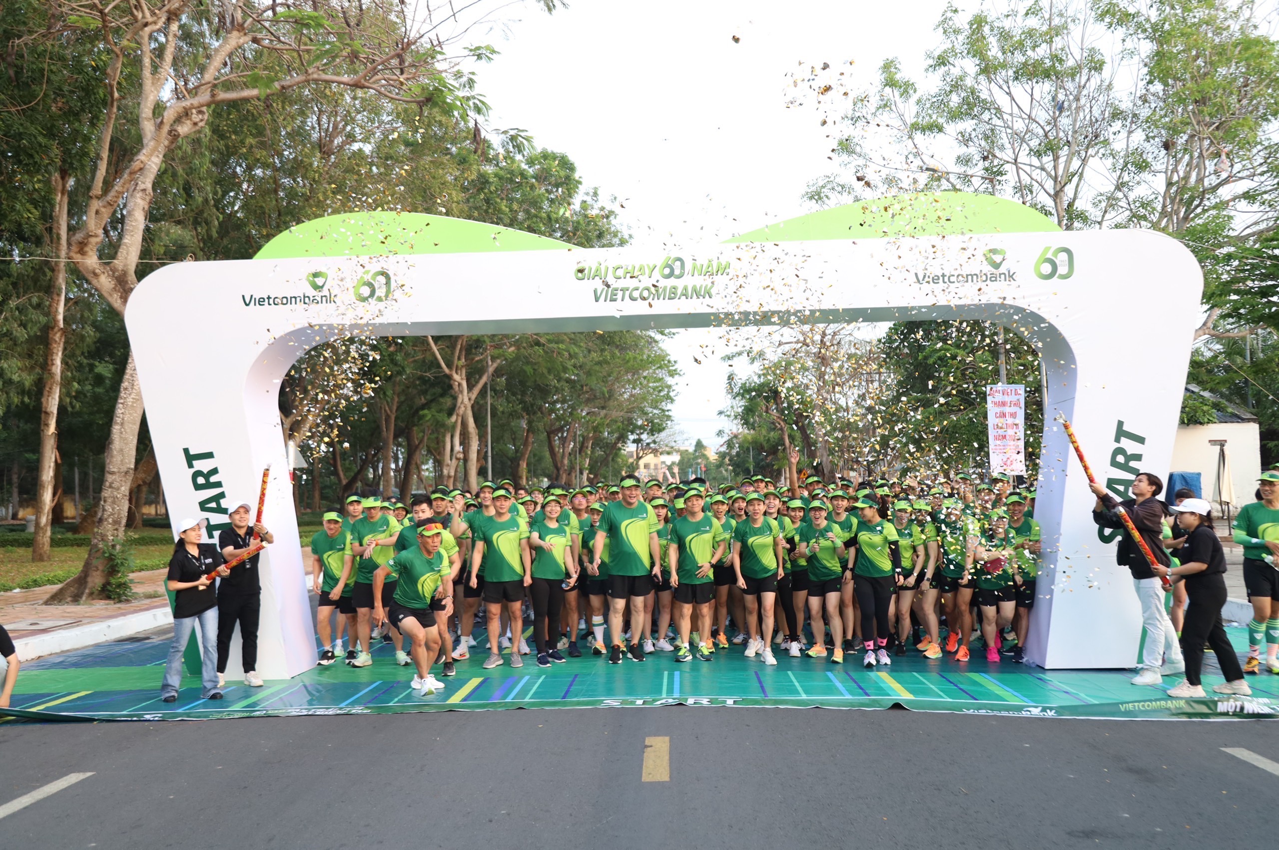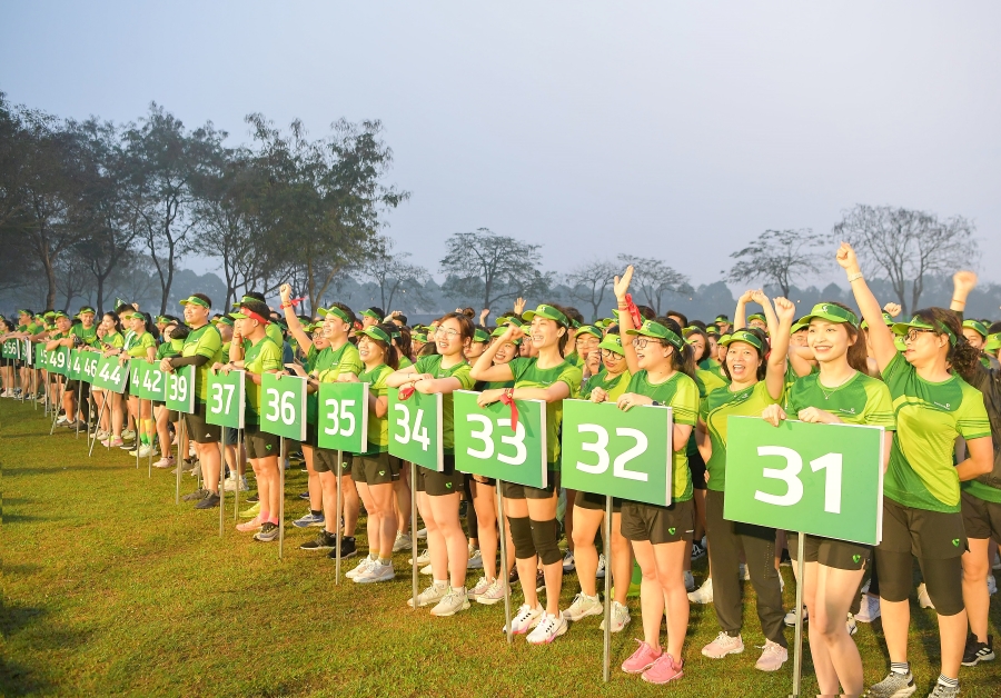 Ban lãnh đạo cùng hơn 3.000  vận động viên là cán bộ, người thân và khách hàng của Vietcombank tại điểm cầu Hà Nội  tham gia giải chạy 60 năm Vietcombank “Vạn trái tim - Một niềm tin” đóng góp cho Quỹ “Vững tương lai”