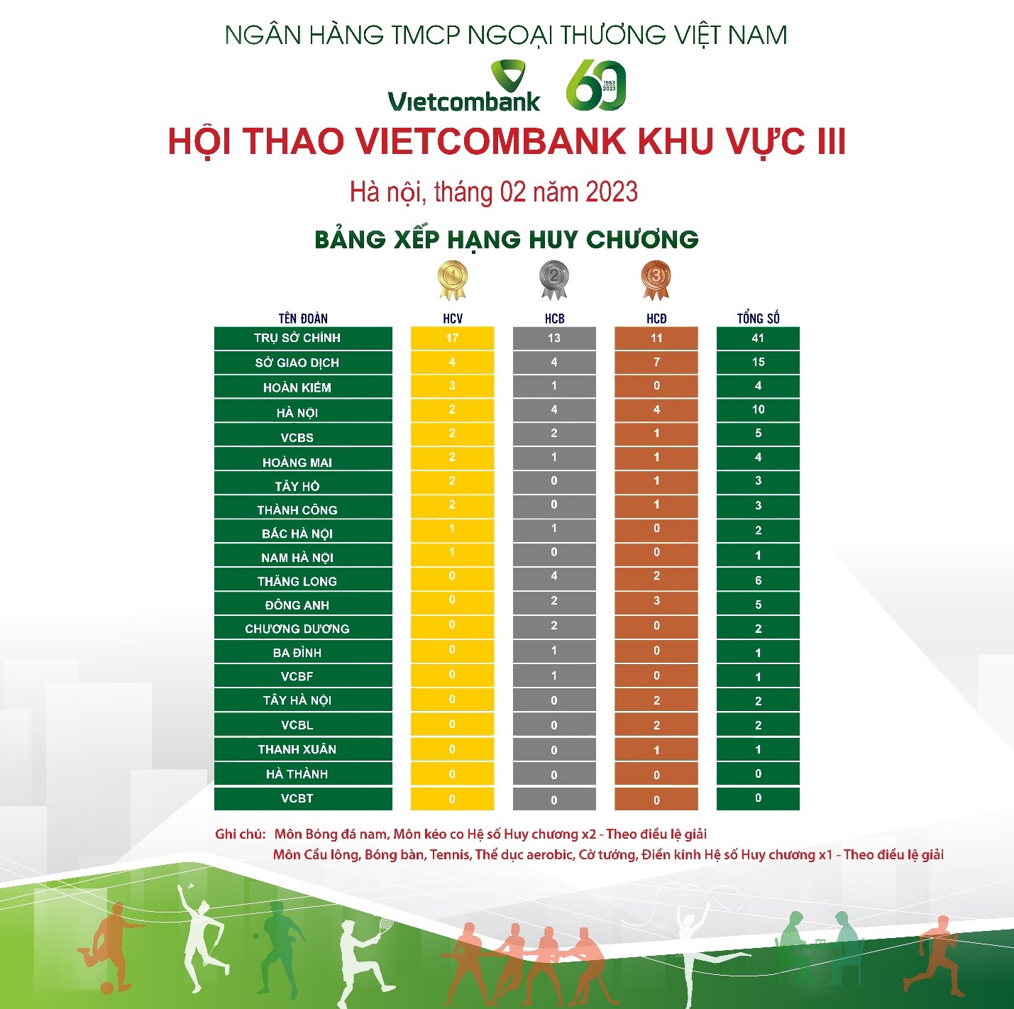 Ban tổ chức Hội thao khu vực 3 đã xây dựng kế hoạch, triển khai, tổ chức thi đấu giữa các Công đoàn cơ sở và nhận được sự tham gia của hơn 1.200 lượt vận động viên tiêu biểu đến từ Trụ sở chính, 15 chi nhánh và 4 công ty trực thuộc Vietcombank trên địa bàn Hà Nội tranh tài tại 8 bộ môn thi đấu gồm: bóng đá, bóng bàn, cầu lông, cờ tướng, điền kinh, aerobic, kéo co, quần vợt. Thông qua Hội thao, các vận động viên có cơ hội được giao lưu, học hỏi, trao đổi kinh nghiệm, đồng thời tuyển chọn được các vận động viên có tài năng, tinh nhuệ nhất, đại diện khu vực Hà Nội tham gia Hội thao toàn hệ thống Vietcombank.