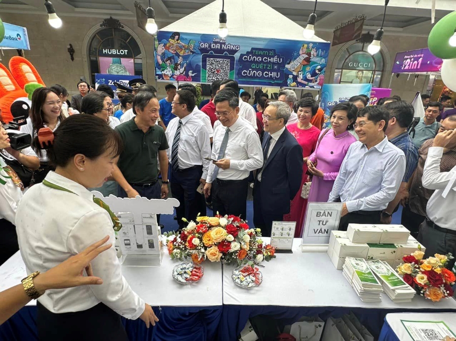 Ông Phạm Tuấn Long - Phó Bí thư quận ủy, Chủ tịch UBND quận Hoàn Kiếm (thứ 5 từ trái sang) và các Phó Chủ tịch quận tham quan gian hàng của Vietcombank Chương Dương