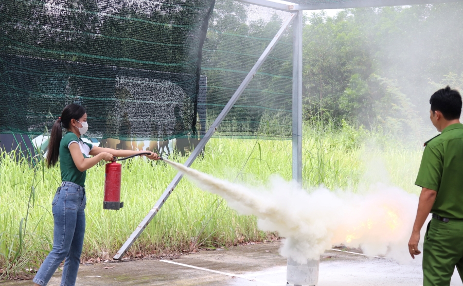 Cán bộ nhân viên thực hành sử dụng bình chữa cháy dập tắt đám cháy từ bình ga