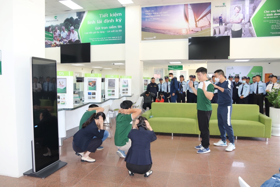 Cán bộ và bảo vệ Vietcombank Chí Linh diễn tập tình huống giả định tại chi nhánh khi xảy ra trộm, cướp có vũ khí