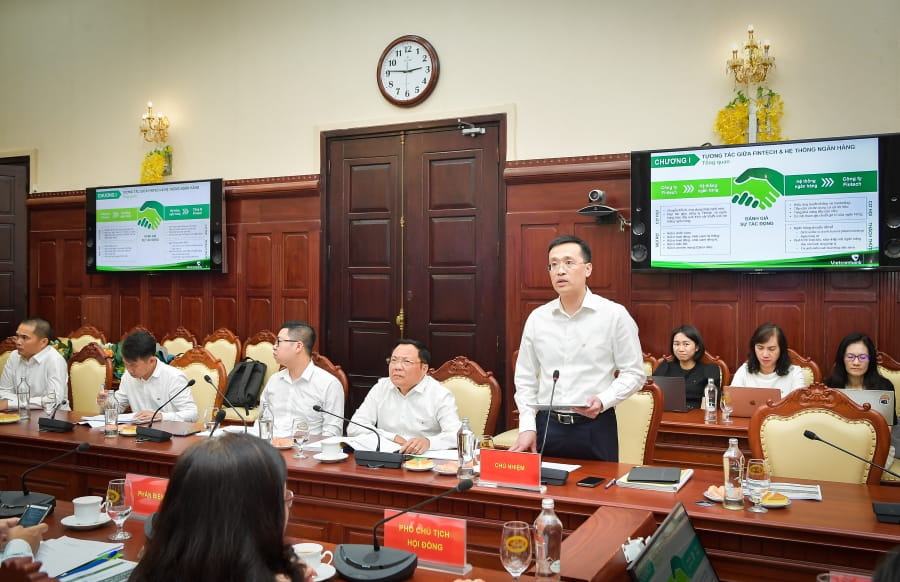 Chủ nhiệm đề tài - ông Phạm Quang Dũng đã trình bày khái quát quá trình thực hiện đề tài, làm rõ các nội dung nổi bật và kết quả của nghiên cứu. Quá trình nghiên cứu đã được triển khai thực hiện một cách nghiêm túc, bài bản. Nhiều nguồn tài liệu có uy tín đã được tham khảo và trích dẫn; các buổi hội thảo khoa học được tổ chức để lấy ý kiến từ các chuyên gia; đặc biệt Nhóm nghiên cứu đã thực hiện khảo sát toàn diện với mẫu tương đối lớn, bao gồm các NHTM, công ty Fintech và hơn 350 khách hàng của Vietcombank làm dữ liệu phân tích cho đề tài.