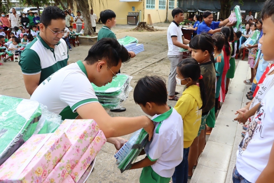 Đoàn đã trao tặng tại 2 địa điểm là UBND xã Phước Hưng và trường tiểu học xã Tập Sơn (huyện Trà Cú, tỉnh Trà Vinh). Mỗi phần quà trao đến các em gồm 1 ba lô và 10 quyển vở trắng, đây đều là những hành trang cần thiết để các em bước vào năm học mới.